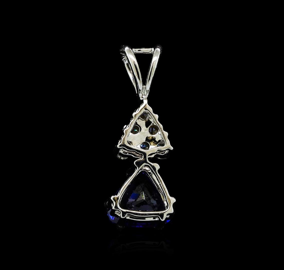 One electronically tested 14KT white gold lady's combination cast & assembled fashion pendant with a bright polish finish. The featured lady's pendant has a stacked double triangle motif with a length of 18.75 millimeters. Identified with markings of '14K'. Condition is new, good workmanship. Containing: One prong set triangle modified brilliant cut natural blue sapphire, measuring 6.47 x 6.15 x 3.13mm, (depth est.) 10%. bulge factor, approximate weight of 1.01ct., clarity is eye clean, medium, strong, blue color, (GIA B 5/5), cut is very good. Transmitting light with no distortion, transparent. Colored gemstones are presumed to have been subjected to commonly used enhancement processes. Graded in the setting. Six prong set round brilliant cut diamonds, measuring 1.80 - 1.75 x 1.10mm (depth est.) approximate total weight of 6 Stones = 0.13ct. Graded in the setting. Clarity VS-2 to SI-1. Color: I - J Cut Very Good. Total Weight of Colored Stones 1.01ct.. Total Weight of Diamonds 0.13ct.. Total Weight of Pendant 1.30gm GAS Appraised at $4,810.00.