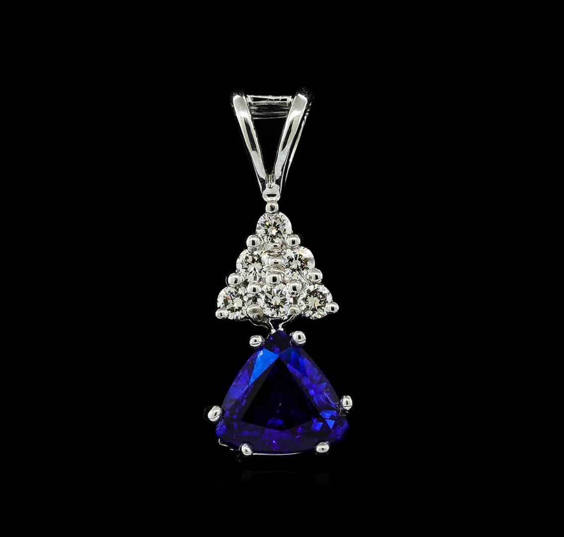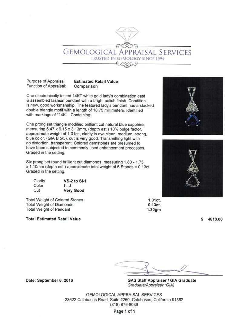 One electronically tested 14KT white gold lady's combination cast & assembled fashion pendant with a bright polish finish. The featured lady's pendant has a stacked double triangle motif with a length of 18.75 millimeters. Identified with markings of '14K'. Condition is new, good workmanship. Containing: One prong set triangle modified brilliant cut natural blue sapphire, measuring 6.47 x 6.15 x 3.13mm, (depth est.) 10%. bulge factor, approximate weight of 1.01ct., clarity is eye clean, medium, strong, blue color, (GIA B 5/5), cut is very good. Transmitting light with no distortion, transparent. Colored gemstones are presumed to have been subjected to commonly used enhancement processes. Graded in the setting. Six prong set round brilliant cut diamonds, measuring 1.80 - 1.75 x 1.10mm (depth est.) approximate total weight of 6 Stones = 0.13ct. Graded in the setting. Clarity VS-2 to SI-1. Color: I - J Cut Very Good. Total Weight of Colored Stones 1.01ct.. Total Weight of Diamonds 0.13ct.. Total Weight of Pendant 1.30gm GAS Appraised at $4,810.00.