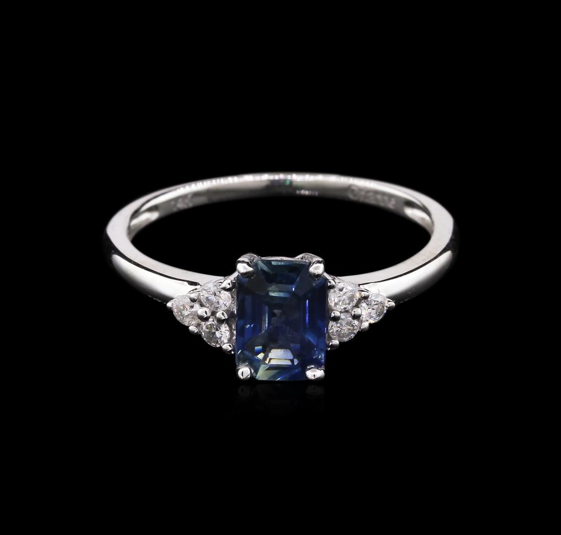 Fourteen karat (14K) white gold sapphire and diamond ring. An emerald cut sapphire corundum gemstone is prong mounted in the center of the ring. Round brilliant cut diamonds accent the ring around the center gemstone. The ring is cast stamped "14K" and has a gross weight of 1.9 Grams. Diamond(s): Shape: Round Brilliant Cut. Weight: 0.14 carat. Average Clarity: SI3. Average Color: H-J. Symmetry: Very Good. Polish: Very Good. GemStone(s): GemStone: Sapphire Corundum. Nature: Natural. Shape: Emerald, Faceted. Quantity: 1, Mounted. Weight: 1.01 carat. Dimensions: Length- 7.04 mm. ; Width- 4.94 mm. Bulge: Visible. Clarity: SI, Type 2. Color: Blue: (4/5). Symmetry: Very Good. Color Intensity: Medium. Transparency: Transparent. Tone: Medium. Metal(s): Metal: Gold, Stamped. Purity: 14K. Color: White. Condition: Excellent. Finish: High polish. GGA Appraised.