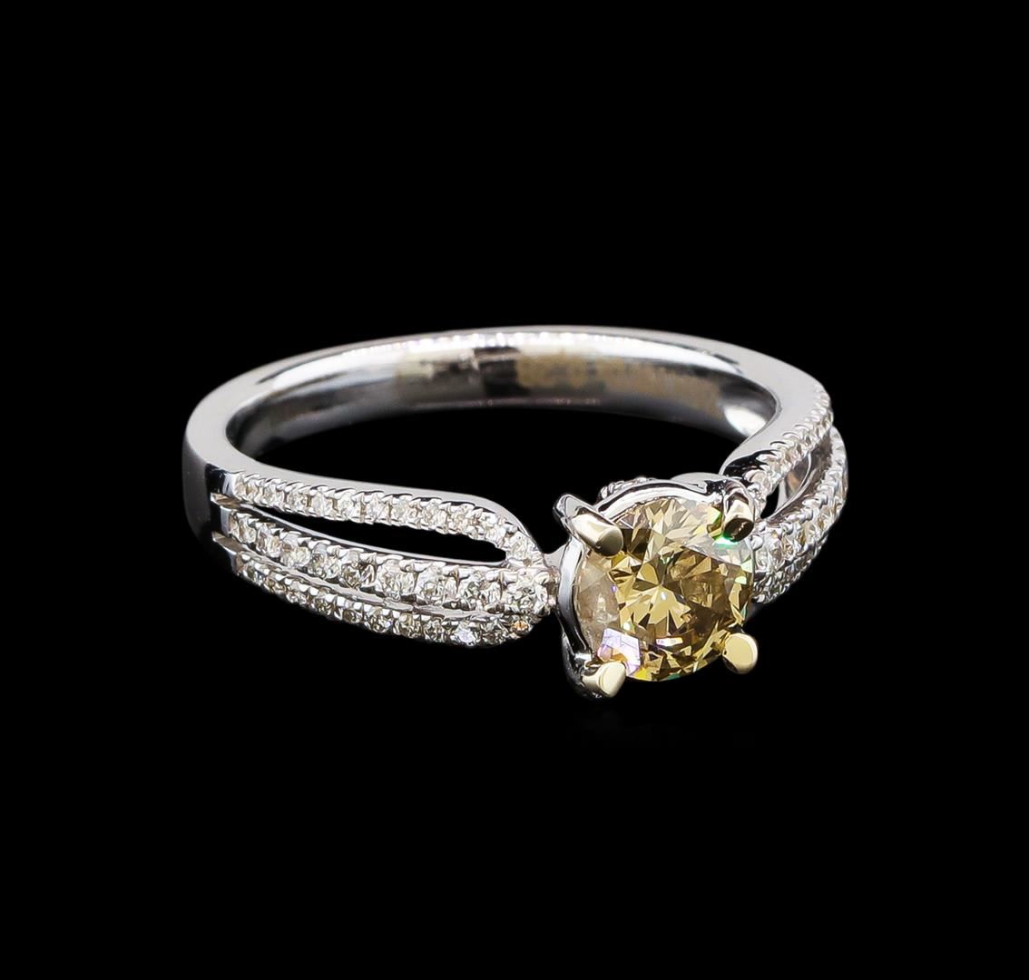 One electronically tested 18KT white gold lady's cast wedding ring with a bright polish finish. Condition is new, good workmanship. The featured ladies ring has a three row split and tapered shank measuring 2.50 millimeters in width. Identified with markings of "750". Containing: One prong set round brilliant cut diamond, measuring 5.75 - 5.74 x 3.60mm (depth est.) approximate weight of 0.73ct. Graded in the setting. Clarity: I-1. Color: Fancy Brown. Cut: Very Good. Nine prong set round brilliant cut diamonds, measuring 1.30 - 1.00 x 0.71mm (depth est.) approximate total weight of 9 stones = 0.06ct. Graded in the setting. Clarity: SI-1 to SI-2. Color: G - H. Cut: Very Good. Forty-eight prong set round brilliant cut diamonds, measuring 1.10 - 1.00 x 0.65mm (depth est.) approximate total weight of 48 Stones = 0.22ct. Graded in the setting. Clarity: SI-1 to SI-2. Color: G - H. Cut: Very Good. Total Weight of Diamonds: 1.01ct. Total Weight of Ring: 3.90gm. GAS Appraised.