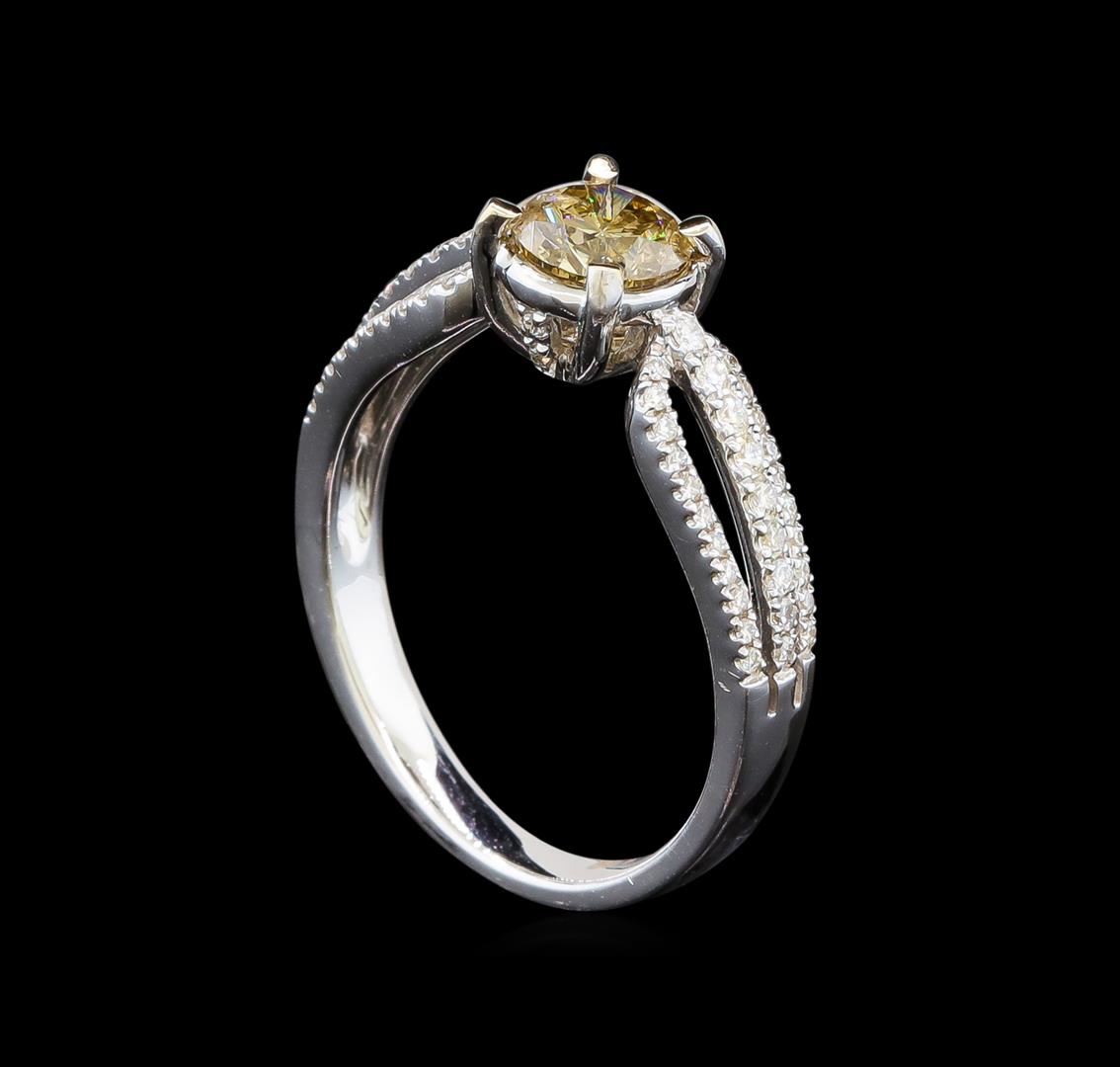 One electronically tested 18KT white gold lady's cast wedding ring with a bright polish finish. Condition is new, good workmanship. The featured ladies ring has a three row split and tapered shank measuring 2.50 millimeters in width. Identified with markings of "750". Containing: One prong set round brilliant cut diamond, measuring 5.75 - 5.74 x 3.60mm (depth est.) approximate weight of 0.73ct. Graded in the setting. Clarity: I-1. Color: Fancy Brown. Cut: Very Good. Nine prong set round brilliant cut diamonds, measuring 1.30 - 1.00 x 0.71mm (depth est.) approximate total weight of 9 stones = 0.06ct. Graded in the setting. Clarity: SI-1 to SI-2. Color: G - H. Cut: Very Good. Forty-eight prong set round brilliant cut diamonds, measuring 1.10 - 1.00 x 0.65mm (depth est.) approximate total weight of 48 Stones = 0.22ct. Graded in the setting. Clarity: SI-1 to SI-2. Color: G - H. Cut: Very Good. Total Weight of Diamonds: 1.01ct. Total Weight of Ring: 3.90gm. GAS Appraised.
