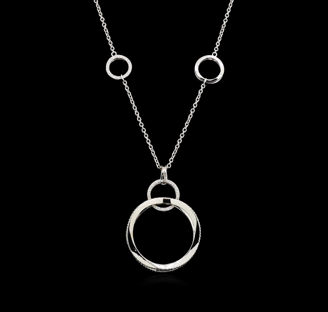 One electronically tested 14KT white gold lady's combination cast & assembled fashion necklace with a lobster claw clasp with a bright polish finish. The featured lady's necklace has a modern interconnected circular motif and a 1.5 millimeter oval cable link chain measuring approximately 18 inches in length. Identified with markings of "585". Condition is new, good workmanship. Containing: Two Hundred Fifty-Seven prong set round brilliant cut diamonds, measuring 1.05 - 1.00 x 0.62mm (depth est.) approximate total weight of 257 Stones = 1.01ct. Graded in the setting. Clarity: SI-1 to I-1. Color: H - I. Cut Good. Total Weight of Diamonds 1.01ct. Total Weight of Necklace 13.00gm. GAS Appraised at $7,360.00.