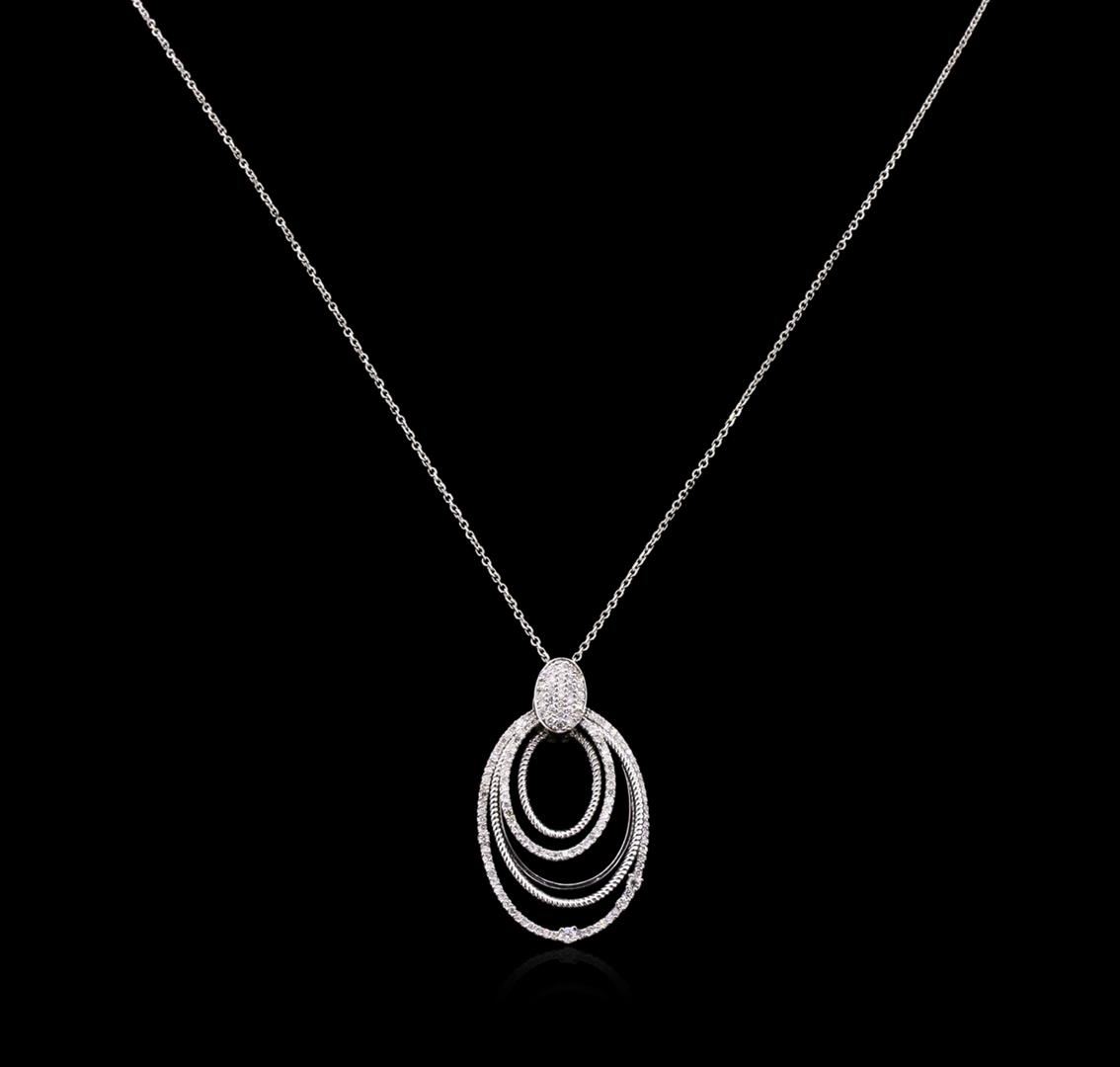 One electronically tested 14KT white gold lady's combination cast & assembled fashion pendant & chain 18.0" long, 1mm diamond cut cable link with a spring ring clasp with a bright polish finish. Identified with markings of "14K". Condition is new, good workmanship. Containing: One Hundred Thirty-One prong set round brilliant cut diamonds, measuring 1.25 - 1.15 x 0.78mm (depth est.) approximate total weight of 131 Stones = 0.90ct. Graded in the setting. Clarity: SI-1 to I-1 . Color: H - I. Cut Good Four prong set round brilliant cut diamonds, measuring 1.90 - 1.85 x 1.22mm (depth est.) approximate total weight of 4 Stones = 0.11ct. Graded in the setting. Clarity: SI-1 to SI-2 . Color: H - I. Cut Good. Total Weight of Diamonds 1.01ct.. Total Weight of Pendant & Chain 8.40gm at $ 4355.00 GAS Appraised.