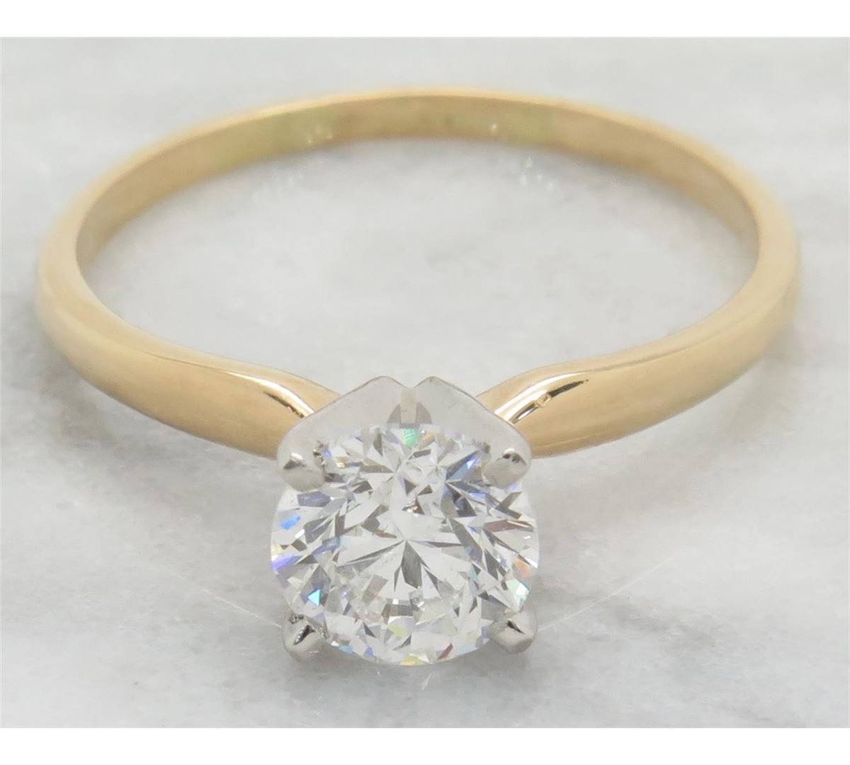 One tested 14K yellow gold diamond ring. Containing: One IGI Certified Round Brilliant Cut Diamond set in a platinum head. Size: 1.01CT, Clarity: SI2, Color: H. Diamonds are graded in the mounting, unless otherwise stated. Weight: 2.1 grams, Size: 6.5.