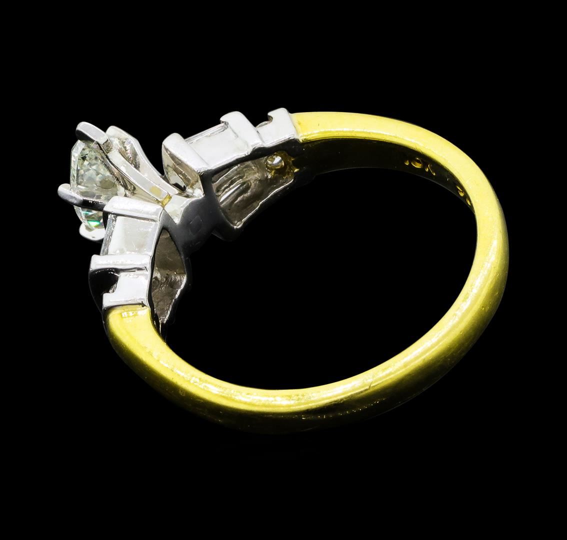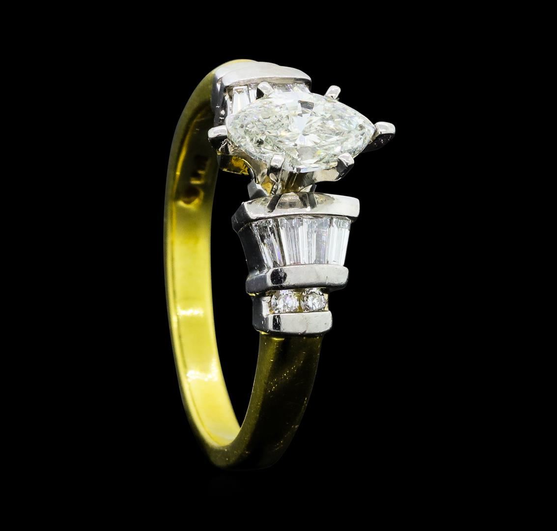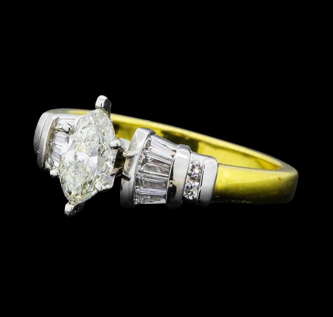 One electronically tested 18KT-platinum yellow gold lady's combination cast & assembled wedding ring with a cathedral shank with a bright polish finish. The featured lady's ring has a shank measuring 2.33 millimeters wide. Identified with markings of '18K PT950'. Condition is new, good workmanship. Containing: One prong set marquise shaped cut diamond, measuring 7.70 x 4.45 x 3.30mm (depth est.) , 5.00.%. GTCF approximate weight of 0.70ct. Graded in the setting. Color J Clarity I-1 Cut Good Eight channel set baguette cut (tapered) diamonds, measuring from 2.60 x 1.20 x 1.02mm (depth est.) to 2.70 x 1.30 x 1.11mm (depth est.) approximate total weight of 8 Stones = 0.25ct. Graded in the setting. Color G - H Clarity VS-2 to SI-1 Cut Good Four channel set round brilliant cut diamonds, measuring 1.60 - 1.50 x 0.96mm (depth est.) approximate total weight of 4 Stones = 0.06ct. Graded in the setting. Color H - I Clarity VS-2 to SI-1 Cut Good. Total Weight of Diamonds 1.01ct.. Total Weight of Ring 6.20gm GAS Appraised at $4485.00. GAS Appraised at $4,485.00.