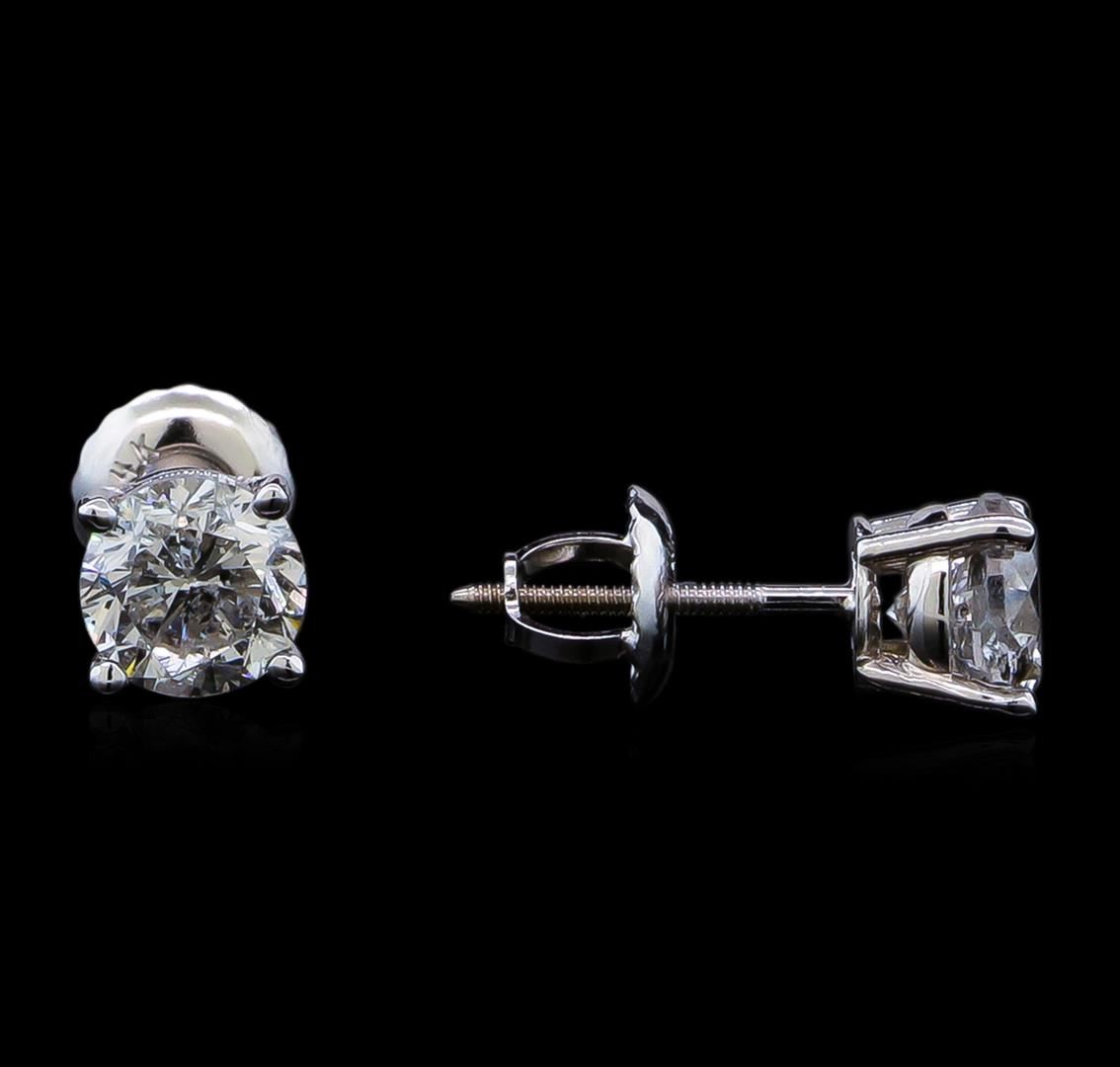 One pair electronically tested 14KT white gold lady's combination cast & assembled diamond stud earrings with threaded posts and screw-on/screw-off backs with a basket setting with a bright polish finish. Identified with markings of "14K". Condition is new, good workmanship. Containing: One prong set round brilliant cut diamond, measuring 5.02 - 5.00 x 3.36mm (depth est.) approximate weight of 0.52ct. Graded in the setting. Clarity: SI-2. Color: Good One prong set round brilliant cut diamond, measuring 4.94 - 4.92 x 3.20mm (depth est.) , 3.00.%. GTCF approximate weight of 0.49ct. Graded in the setting. Clarity: SI-2. Color: Very Good. Total Weight of Diamonds 1.01ct. Total Weight of Stud Earrings 1.00gm. GAS Appraised at $6,570.00.