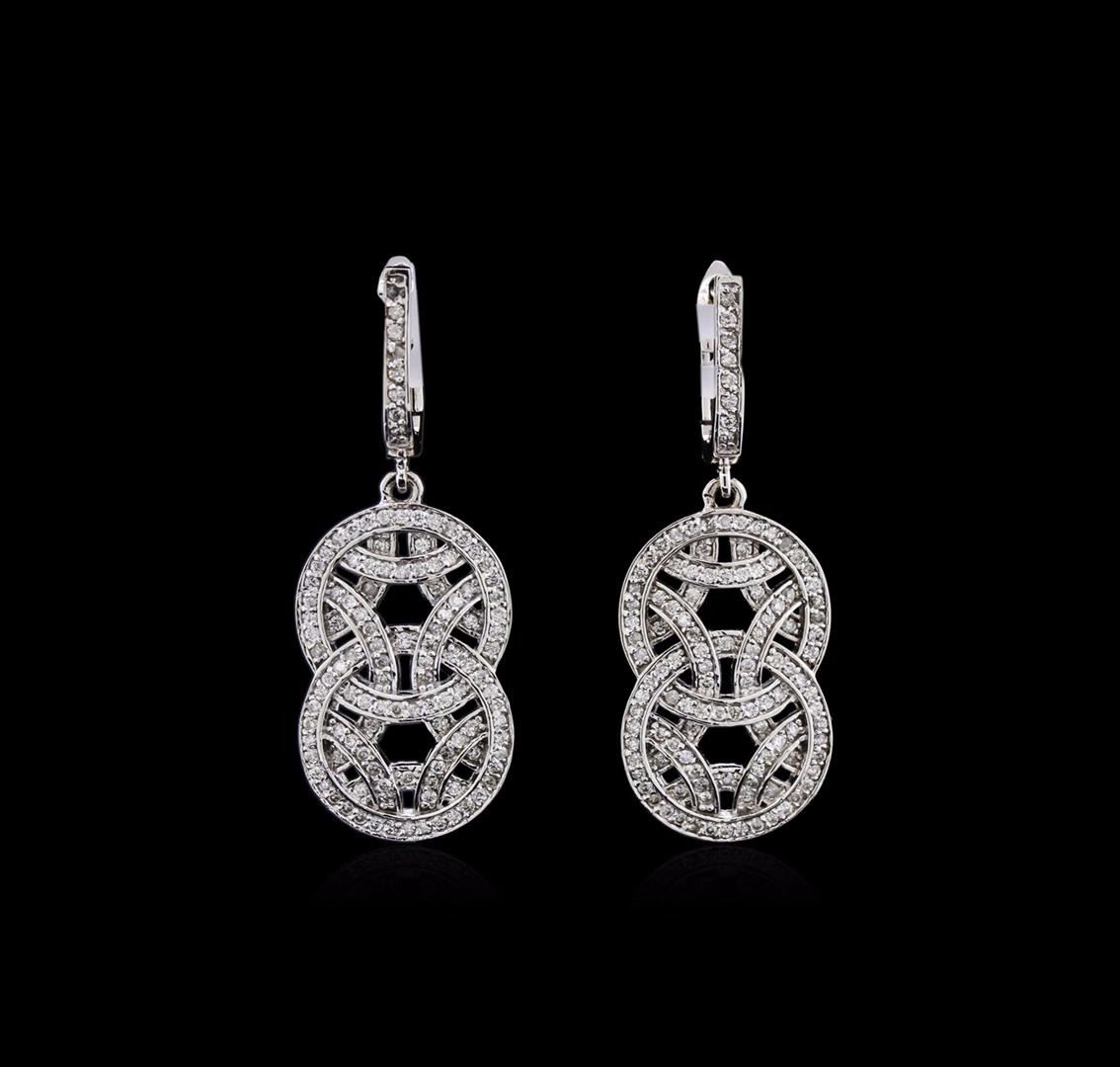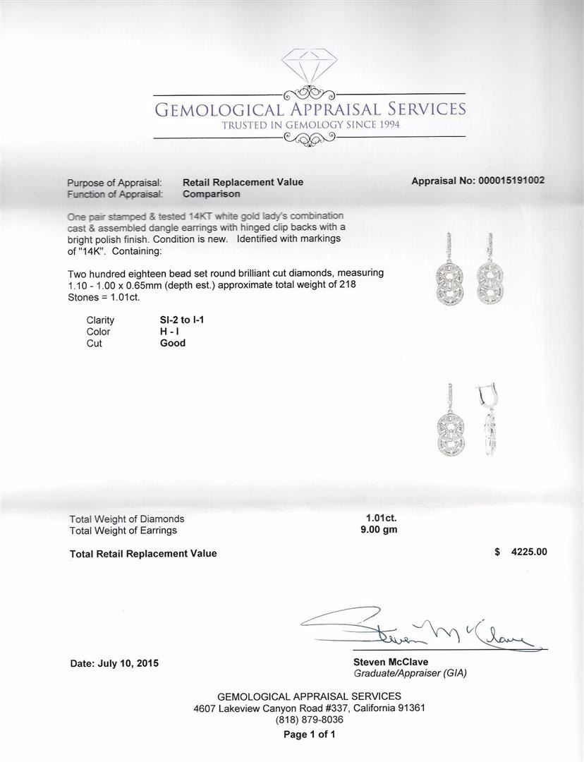 One pair stamped & tested 14KT white gold lady's combination cast & assembled dangle earrings with hinged clip backs with a bright polish finish. Condition is new. Identified with markings of "14K". Containing: Two hundred eighteen bead set round brilliant cut diamonds, measuring 1.10 - 1.00 x 0.65mm (depth est.) approximate total weight of 218 Stones = 1.01ct. Clarity: SI-2 to I-1. Color: H - I. Cut: Good. Total Weight of Diamonds: 1.01ct. Total Weight of Earrings: 9.00 gm. GAS Appraised at $4,225.00.