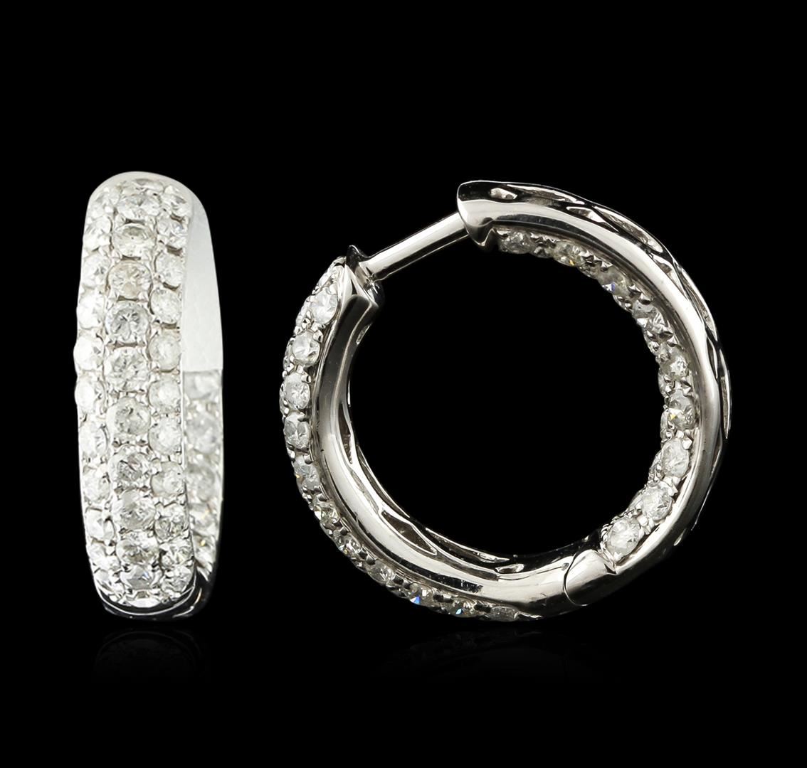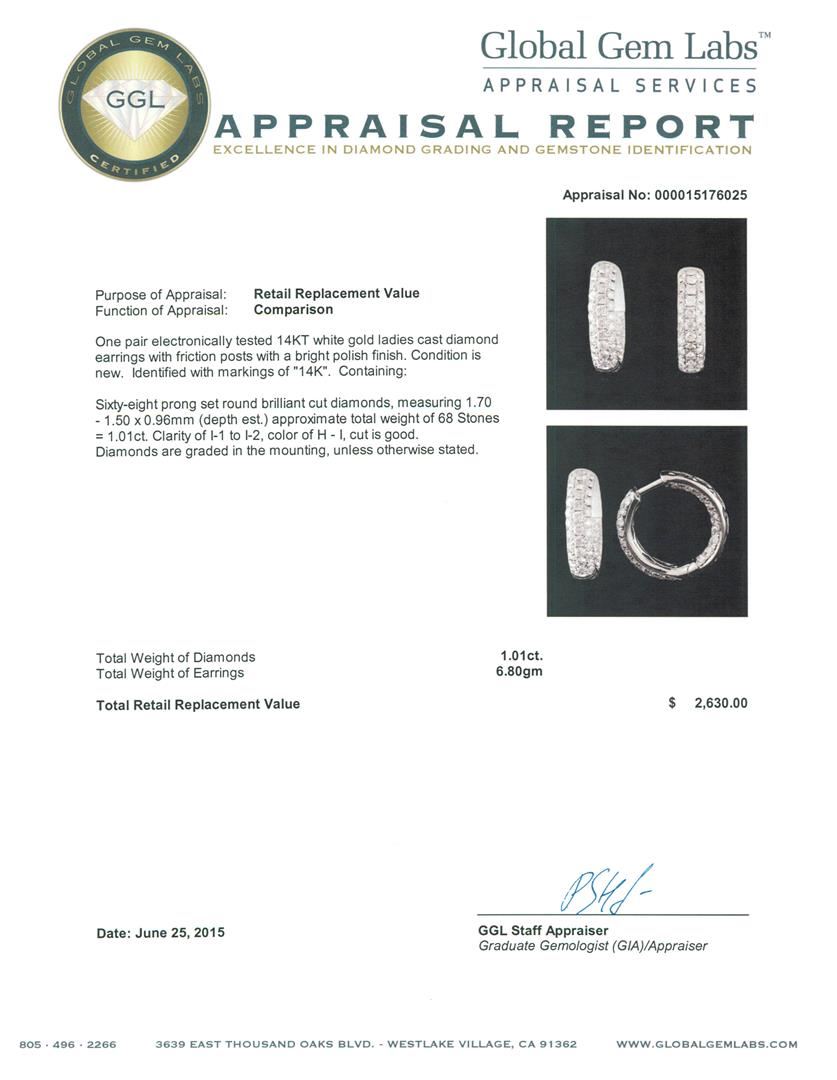 One pair electronically tested 14KT white gold ladies cast diamond earrings with friction posts with a bright polish finish. Identified with markings of "14K". Condition is new. Containing: Sixty-Eight prong set round brilliant cut diamonds, measuring 1.70 - 1.50 x 0.96mm (depth est.) approximate. Total Weight of 68 Stones = 1.01ct. Clarity: I-1 to I-2. Color: H - I, Cut is Good. Diamonds are graded in the mounting, unless otherwise stated. Total Weight of Diamonds 1.01ct. Total Weight of Earrings 6.80 grams. GGL Appraised at $2,630.00.