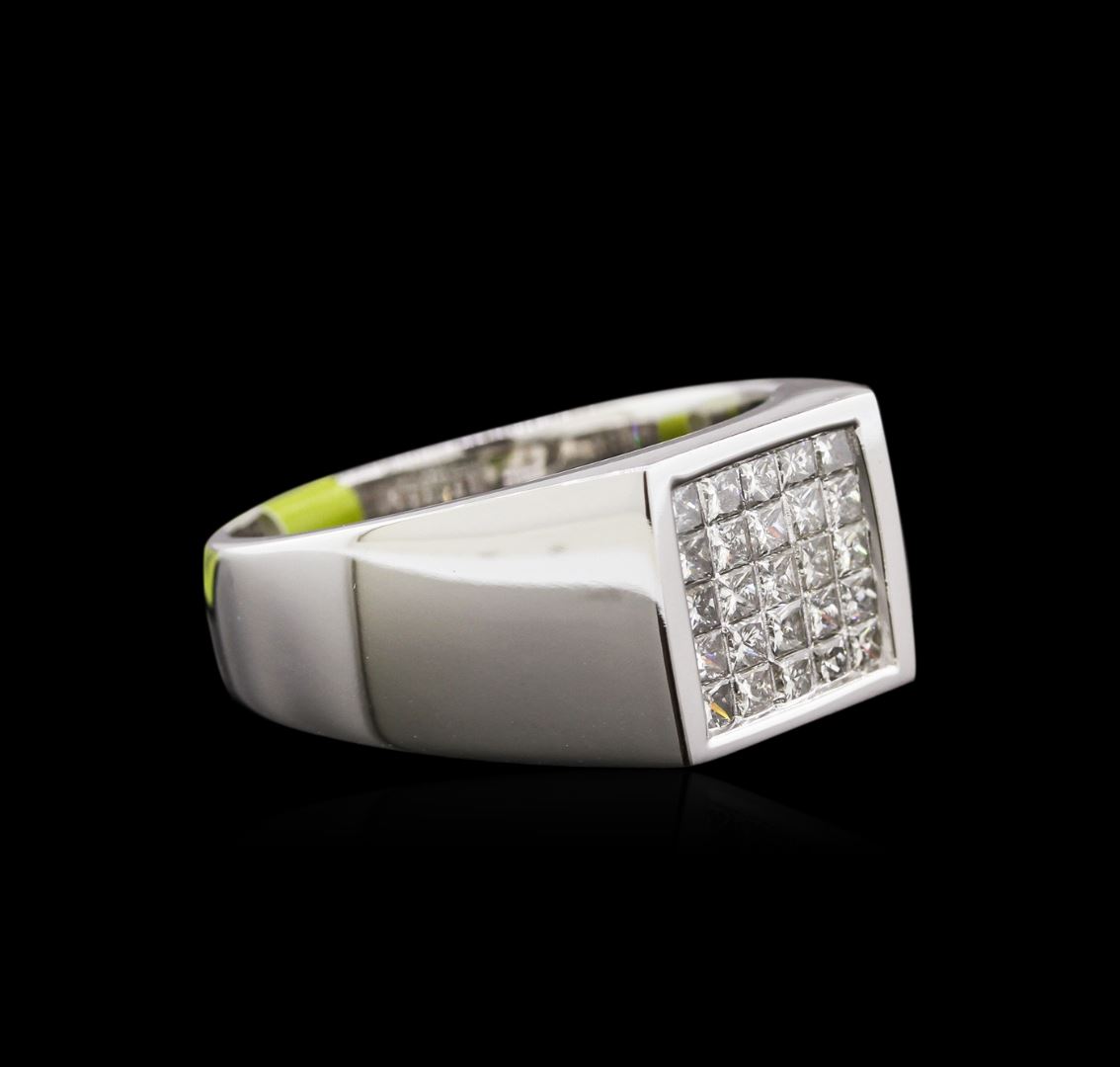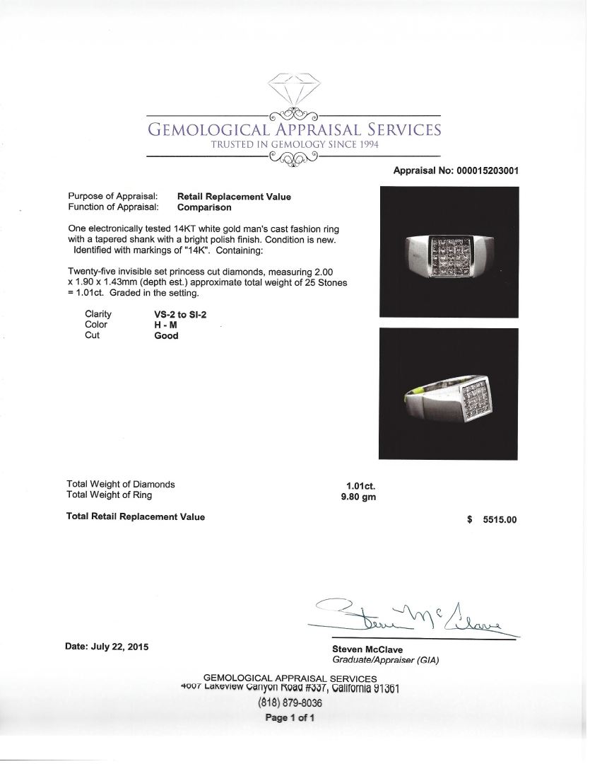One electronically tested 14KT white gold man's cast fashion ring with a tapered shank with a bright polish finish. Condition is new. Identified with markings of "14K". Containing: Twenty-five invisible set princess cut diamonds, measuring 2.00 x 1.90 x 1.43mm (depth est.) approximate total weight of 25 Stones = 1.01ct. Graded in the setting. Clarity: VS-2 to SI-2. Color: H - M. Cut: Good. Total Weight of Diamonds: 1.01ct. Total Weight of Ring: 9.80 gm. GAS Appraised at $5,515.00.