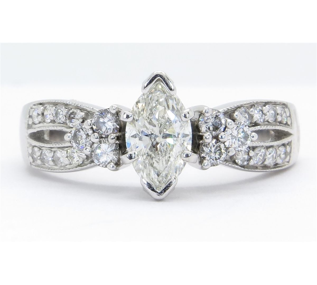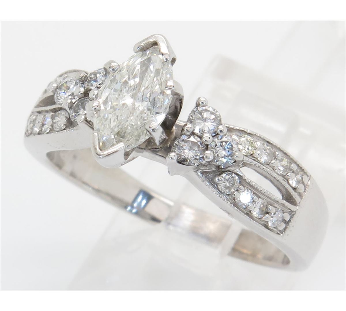 One tested 14K white gold diamond ring. Containing: One Marquise Cut Diamond. Approximate size: .65CT, Clarity: I, Color: H-I. 22 Round Brilliant Cut Diamonds. Approximate total diamond weight: 1.01CTW. Diamonds are graded in the mounting, unless otherwise stated. Weight: 5.3 grams. Size: 7.25