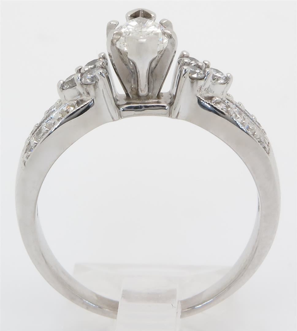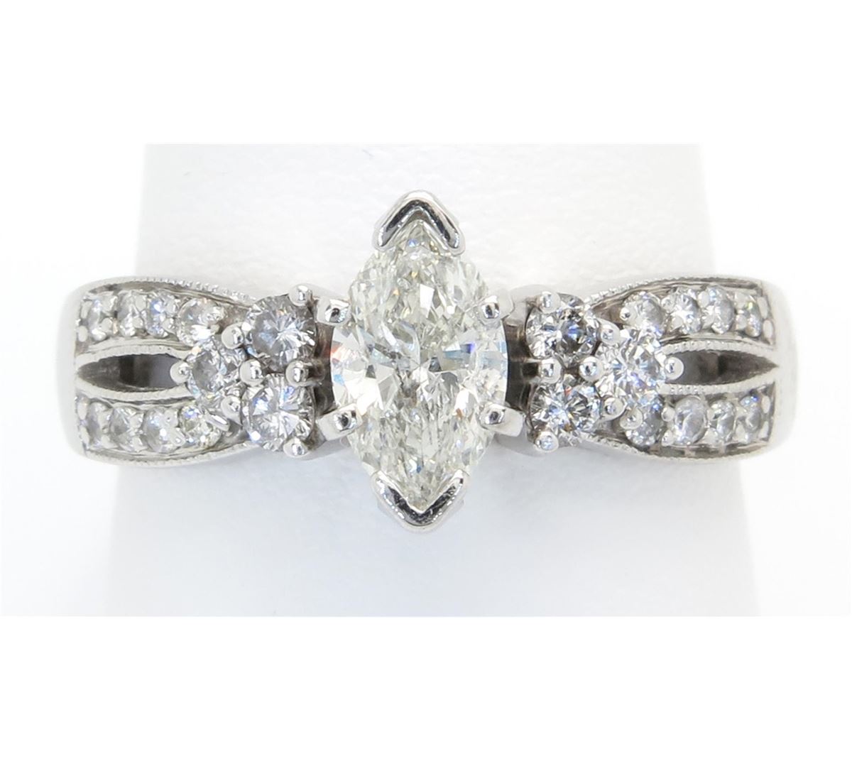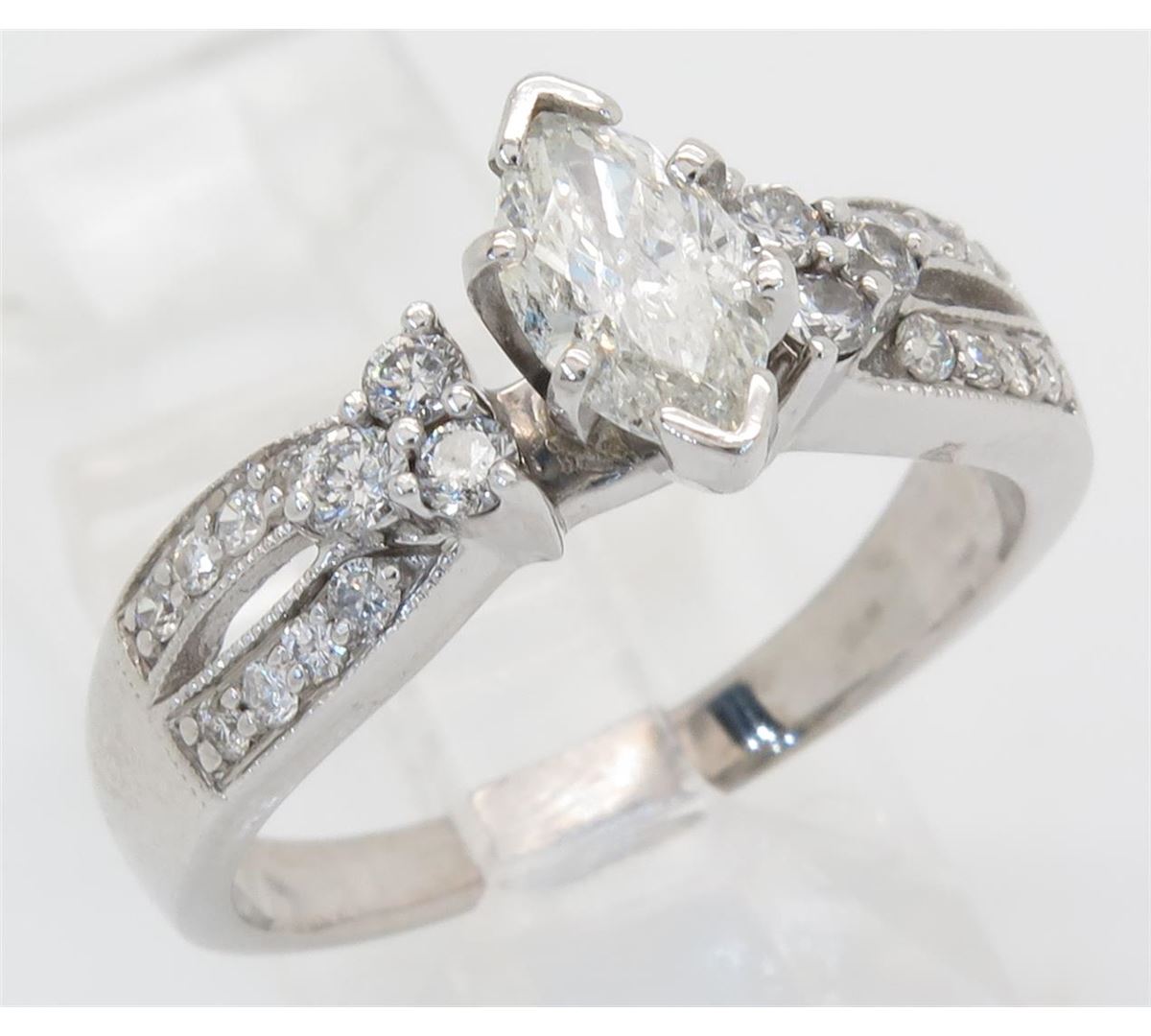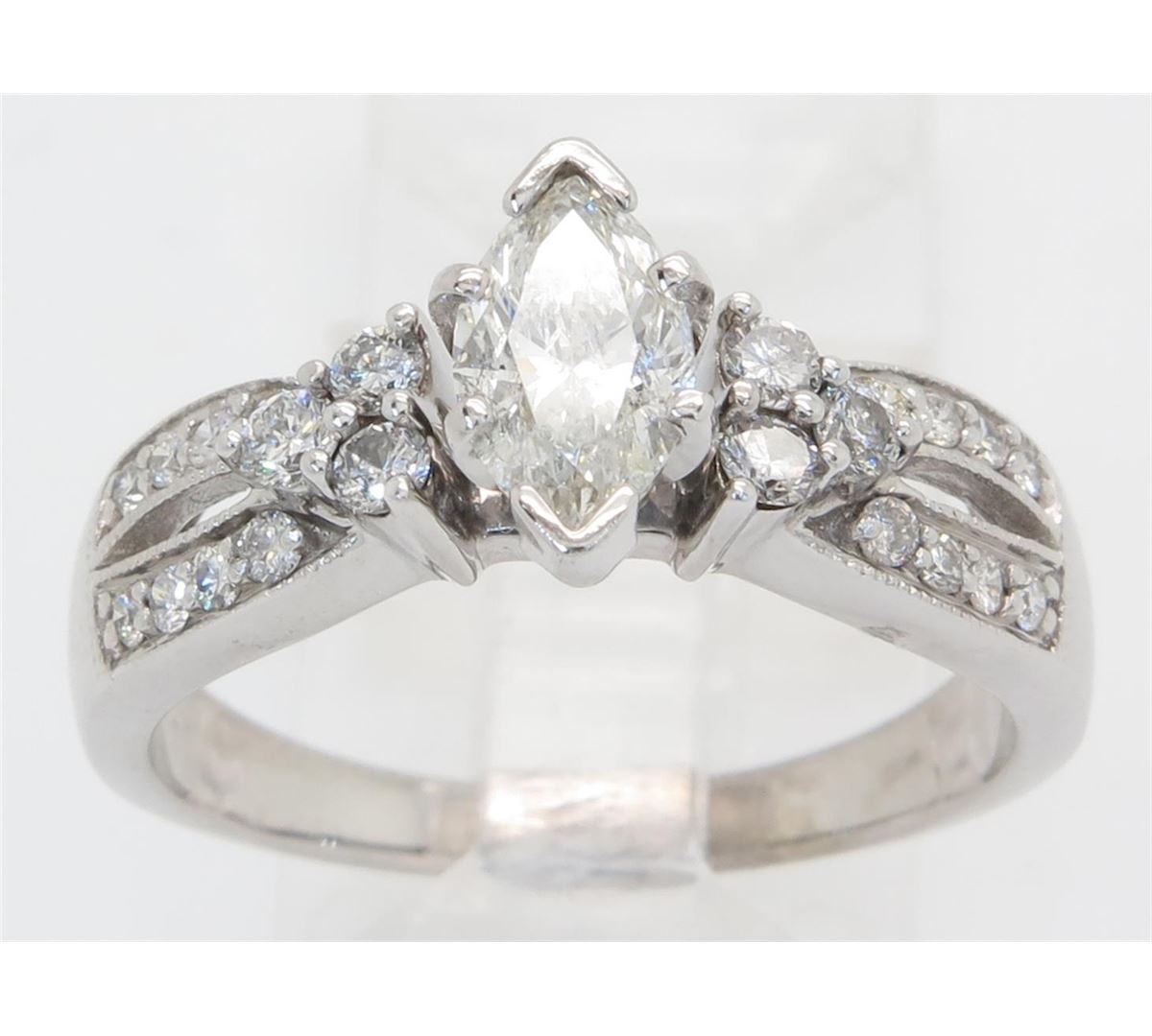 One tested 14K white gold diamond ring. Containing: One Marquise Cut Diamond. Approximate size: .65CT, Clarity: I, Color: H-I. 22 Round Brilliant Cut Diamonds. Approximate total diamond weight: 1.01CTW. Diamonds are graded in the mounting, unless otherwise stated. Weight: 5.3 grams. Size: 7.25