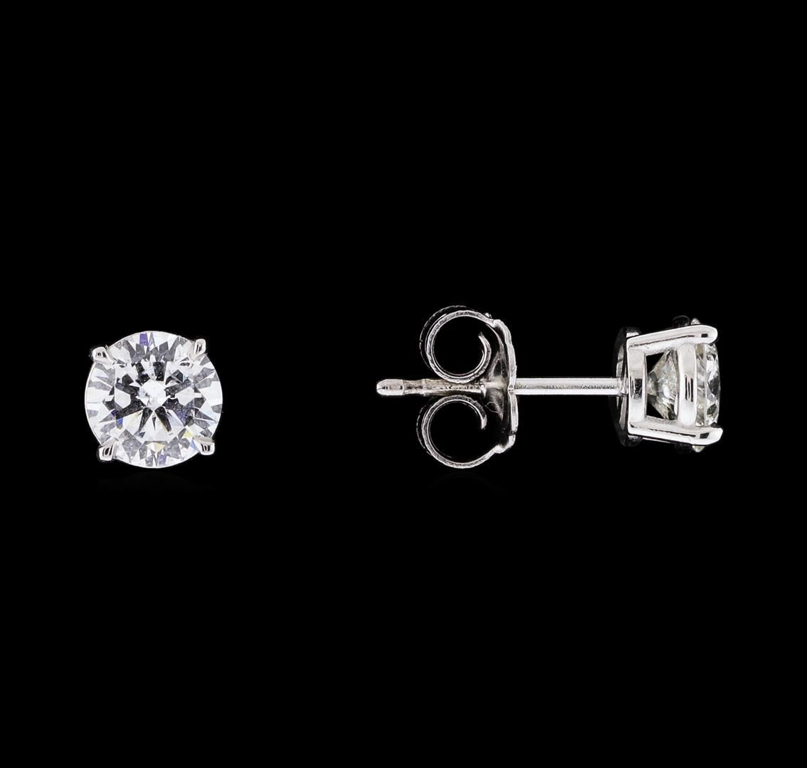 One pair electronically tested 14KT white gold lady's cast stud earrings with friction posts with a basket setting with a bright polish finish. Identified with markings of '14K'. Condition is new, good workmanship. Containing: One prong set round brilliant cut diamond, measuring 5.19 - 5.15 x 3.15mm (depth est.) approximate weight of 0.52ct. Graded in the setting. Clarity SI-2. Color: H Cut Good One prong set round brilliant cut diamond, measuring 5.08 - 5.05 x 3.18mm (depth est.) approximate weight of 0.50ct. Graded in the setting. Clarity I-2. Color: J Cut Good. Total Weight of Diamonds 1.02ct.. Total Weight of Earrings 1.00gm. GAS Appraised at $4,895.00.