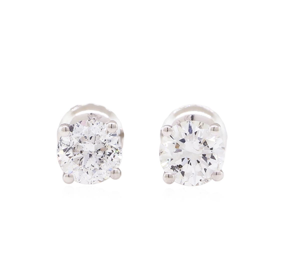 One pair electronically tested 14KT white gold lady's combination cast & assembled 4-prong stud earrings with threaded posts and screw-on/screw-off backs with a bright polish finish. Identified with markings of "14K". Condition is new, good workmanship. Containing: Two prong set round brilliant cut diamonds, measuring 5.14 - 5.08 x 3.27mm (depth est.) approximate total weight of 2 Stones = 1.02ct. Graded in the setting. Clarity: SI-1 to SI-2. Color: G - Very Good. Total Weight of Diamonds 1.02ct. Total Weight of Earrings 1.00gm. GAS Appraised at $7,225.00.
