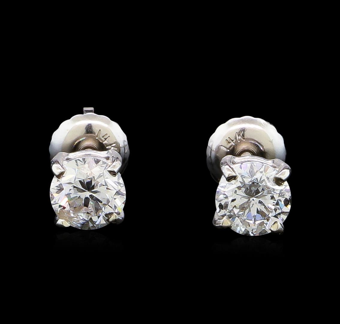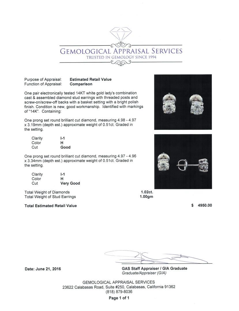 One pair electronically tested 14KT white gold lady's combination cast & assembled diamond stud earrings with threaded posts and screw-on/screw-off backs with a basket setting with a bright polish finish. Identified with markings of "14K". Condition is new, good workmanship. Containing: One prong set round brilliant cut diamond, measuring 4.98 - 4.97 x 3.19mm (depth est.) approximate weight of 0.51ct. Graded in the setting. Clarity: I-1. Color: Good One prong set round brilliant cut diamond, measuring 4.97 - 4.96 x 3.34mm (depth est.) approximate weight of 0.51ct. Graded in the setting. Clarity: I-1. Color: Very Good. Total Weight of Diamonds 1.02ct. Total Weight of Stud Earrings 1.00gm. GAS Appraised at $4,950.00.