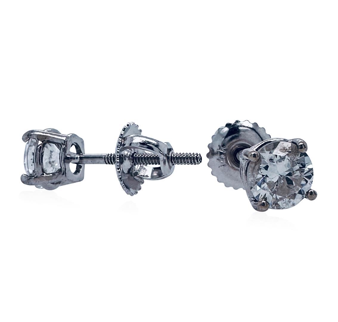 One pair electronically tested 14KT white gold lady's combination cast assembled fashion stud earrings with threaded posts and screw-on/screw-off backs with four prong basket with bright polish finish. Condition is new, good workmanship. Identified with markings of 14K. Containing: 2 prong set round brilliant cut diamonds, approximate total weight of 2 stones = 1.02 ctw. Graded in the setting. Total weight of Diamonds: 1.02 ctw. Total estimated retail value: $6900