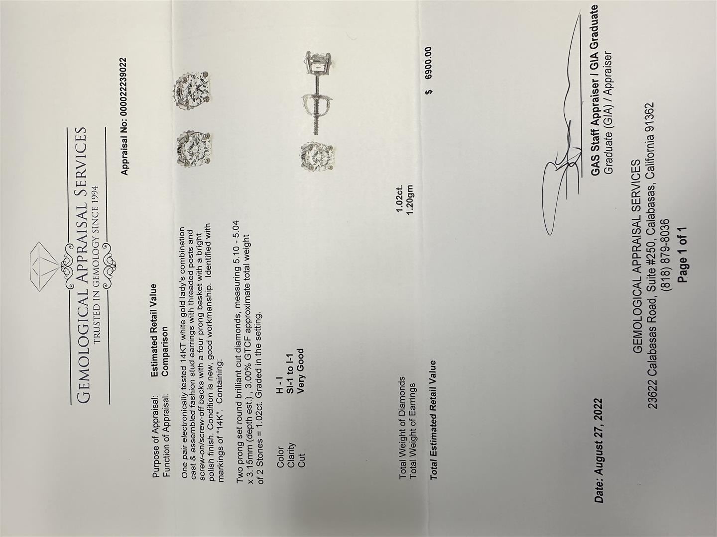 One pair electronically tested 14KT white gold lady's combination cast assembled fashion stud earrings with threaded posts and screw-on/screw-off backs with four prong basket with bright polish finish. Condition is new, good workmanship. Identified with markings of 14K. Containing: 2 prong set round brilliant cut diamonds, approximate total weight of 2 stones = 1.02 ctw. Graded in the setting. Total weight of Diamonds: 1.02 ctw. Total estimated retail value: $6900