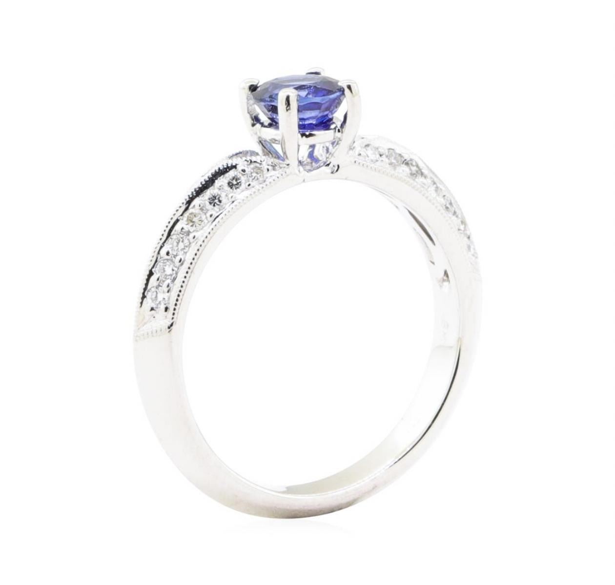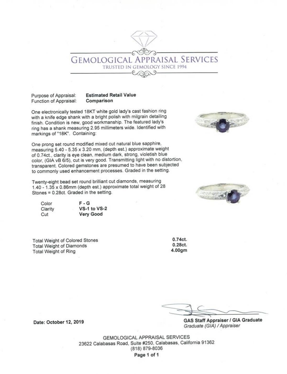 One electronically tested 18KT white gold lady's cast fashion ring with a knife edge shank with a bright polish with milgrain detailing finish. The featured lady's ring has a shank measuring 2.95 millimeters wide. Identified with markings of '18K'. Condition is new, good workmanship. Containing: One prong set round modified mixed cut natural blue sapphire, measuring 5.40 - 5.35 x 3.20 mm, (depth est.) approximate weight of 0.74ct., clarity is eye clean, medium dark, strong, violetish blue color, (GIA vB 6/5), cut is very good. Transmitting light with no distortion, transparent. Colored gemstones are presumed to have been subjected to commonly used enhancement processes. Graded in the setting. Twenty-Eight bead set round brilliant cut diamonds, measuring 1.40 - 1.35 x 0.86mm (depth est.) approximate total weight of 28 Stones = 0.28ct. Graded in the setting. Color F - G Clarity VS-1 to VS-2 Cut Very Good. Total Weight of Colored Stones 0.74ct.. Total Weight of Diamonds 0.28ct.. Total Weight of Ring 4.00gm GAS Appraised at $3120.00. GAS Appraised.