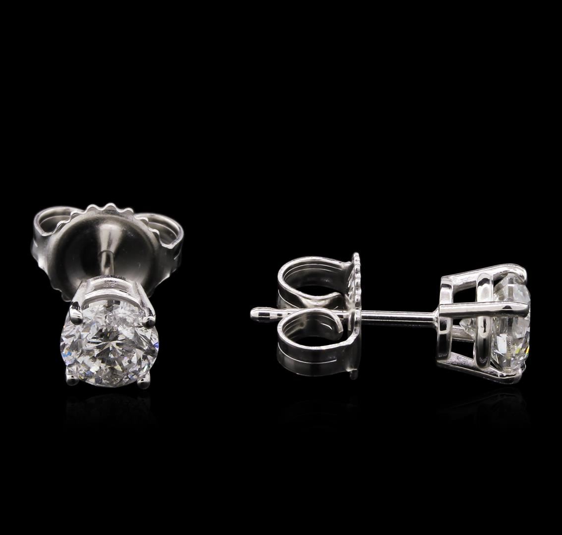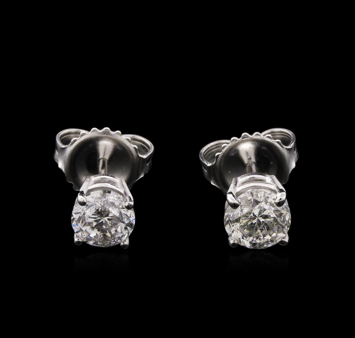One pair electronically tested 14KT white gold cast & assembled diamond solitaire earrings with standard backs. Identified with markings of "14K". Condition is new, good workmanship. Containing: One prong set round brilliant cut diamond, measuring 4.90 - 4.90 x 3.20mm (depth est.), 6.00% GTCF approximate weight of 0.50ct with a medium blue fluorescence. Graded in the setting. Clarity: I-2. Color: 65.3%. Table 59.2%. One prong set round brilliant cut diamond, measuring 5.20 - 5.20 x 3.00mm (depth est.), 4.00% GTCF approximate weight of 0.52ct. Graded in the setting. Clarity: I-2. Color: I. Depth 57.7%. Table 59.6%. Total Weight of Diamonds 1.02ct. Total Weight of Earrings 1.18gm. AIG Appraised at $3,775.00.