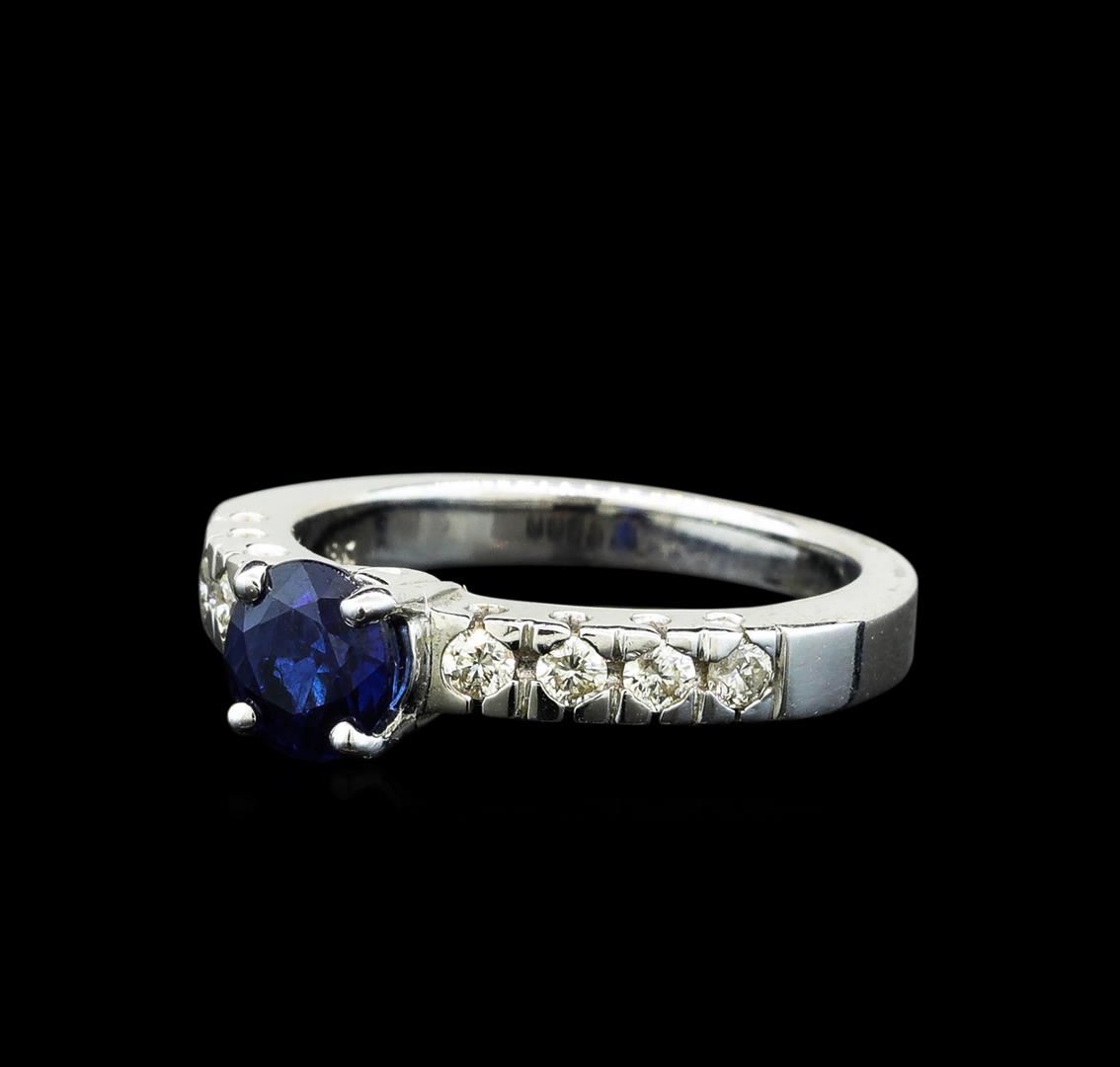 One electronically tested 18KT white gold lady's cast fashion ring with a bright polish finish. The featured lady's ring has a shank measuring 2.50 millimeters wide. Identified with markings of '18K'. Condition is new, good workmanship. Containing: One prong set round modified mixed cut natural blue sapphire, measuring 5.89 - 5.81 x 3.47 mm, (depth est.) 8%. bulge factor, approximate weight of 1.03ct., clarity is slightly included, medium dark, moderately strong, blue color, (GIA B 6/4), cut is very good. Transmitting light with a minimum of distortion, transparent. Colored gemstones are presumed to have been subjected to commonly used enhancement processes. Graded in the setting. Eight prong set round brilliant cut diamonds, measuring 2.20 - 2.10 x 1.33mm (depth est.) approximate total weight of 8 Stones = 0.30ct. Graded in the setting. Clarity SI-1 to SI-2. Color: H - I Cut Good. Total Weight of Colored Stones 1.03ct.. Total Weight of Diamonds 0.30ct.. Total Weight of Ring 4.90gm GAS Appraised at $3,825.00.