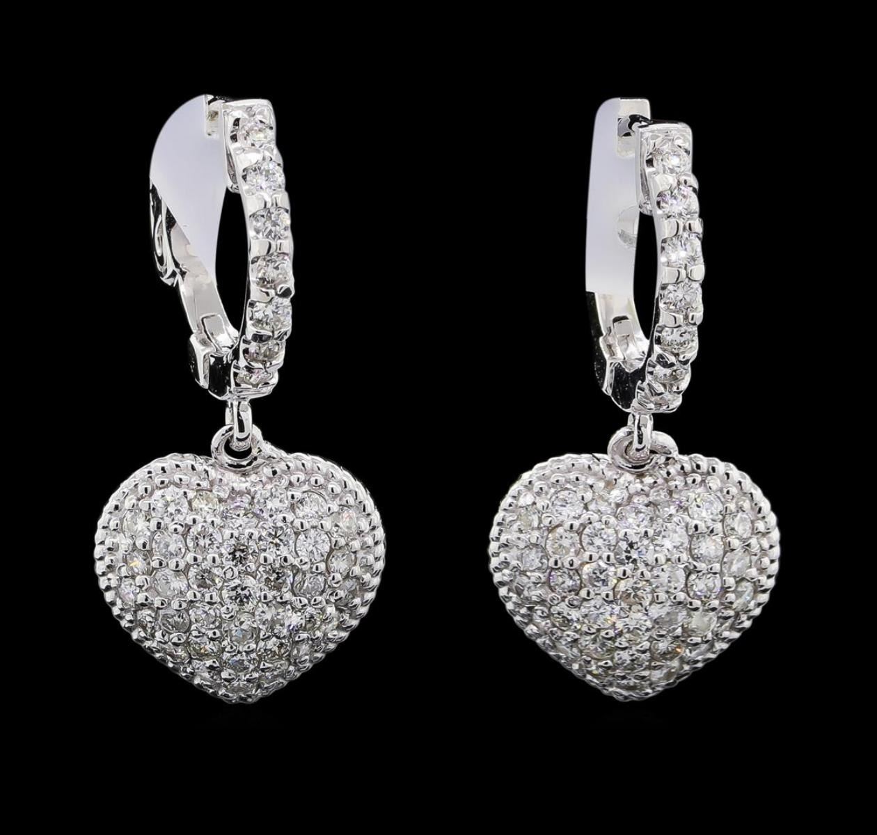 One pair electronically tested 14KT white gold lady's combination cast & assembled heart shape dangle earrings with hinged, snap locking posts with a bright polish finish. The featured lady's earrings have a drop of 25 millimeters. Identified with markings of 'K14'. Condition is new, good workmanship. Containing: Thirty-Six prong set round brilliant cut diamonds, measuring 1.60 - 1.50 x 0.96mm (depth est.) approximate total weight of 36 Stones = 0.51ct. Graded in the setting. Clarity SI-1 to SI-3. Color: G - H Cut Good Fifty prong set round brilliant cut diamonds, measuring 1.40 - 1.35 x 0.86mm (depth est.) approximate total weight of 50 Stones = 0.52ct. Graded in the setting. Clarity SI-1 to SI-2. Color: G - H Cut Good. Total Weight of Diamonds 1.03ct.. Total Weight of Earrings 5.20gm. GAS Appraised.