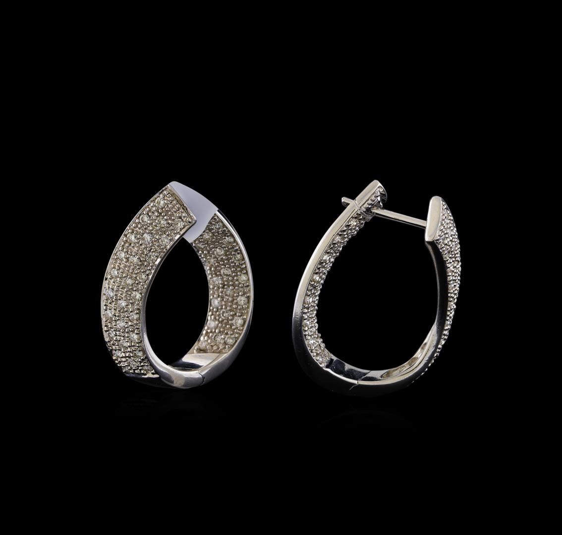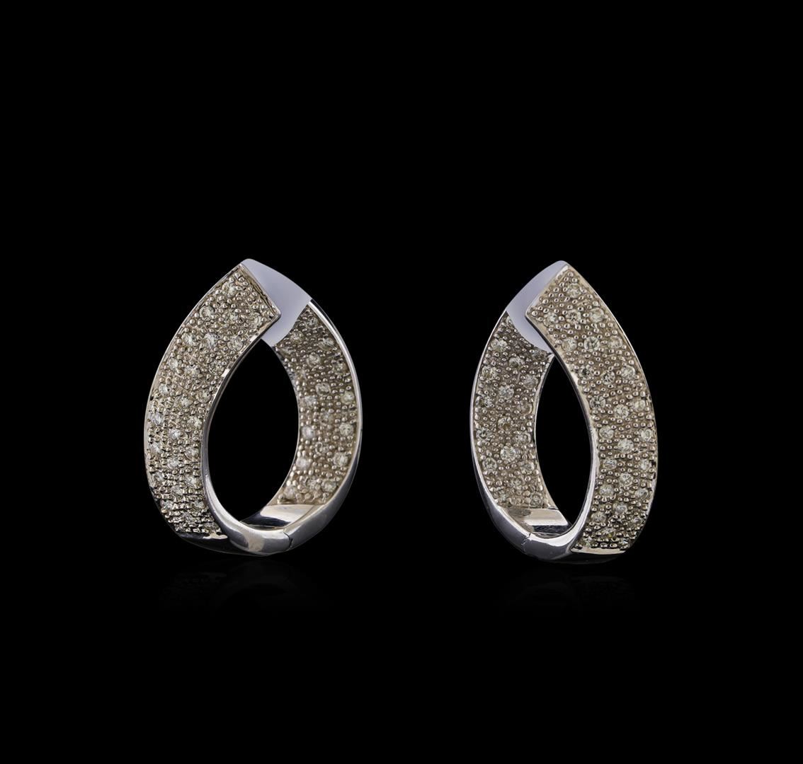 One pair electronically tested 14KT white gold lady's combination cast & assembled fashion hoop earring with hinged, snap locking posts with a bright polish finish. The featured lady's earrings measure 27 millimeters in length with three rows of diamonds. Identified with markings of "14K". Condition is new, good workmanship. Containing: One Hundred Four prong set round brilliant cut diamonds, measuring 1.40 - 1.35 x 0.86mm (depth est.) approximate total weight of 104 Stones = 1.03ct. Graded in the setting. Clarity: SI-1 to SI-2. Color: H - I. Cut Good. Total Weight of Diamonds 1.03ct. Total Weight of Hoop Earring 11.40gm. GAS Appraised at $4,260.00.