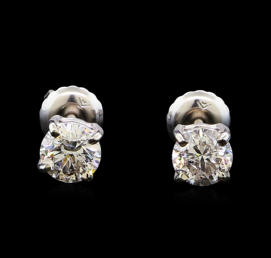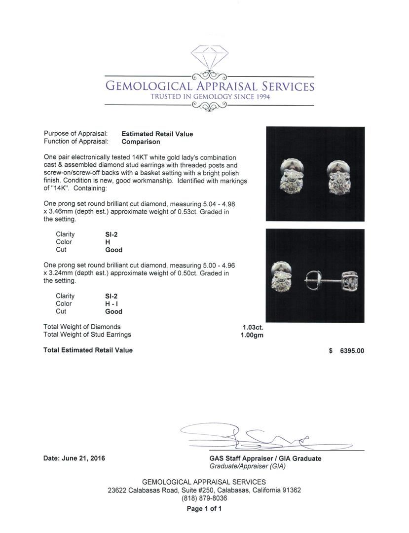 One pair electronically tested 14KT white gold lady's combination cast & assembled diamond stud earrings with threaded posts and screw-on/screw-off backs with a basket setting with a bright polish finish. Identified with markings of "14K". Condition is new, good workmanship. Containing: One prong set round brilliant cut diamond, measuring 5.04 - 4.98 x 3.46mm (depth est.) approximate weight of 0.53ct. Graded in the setting. Clarity: SI-2. Color: Good One prong set round brilliant cut diamond, measuring 5.00 - 4.96 x 3.24mm (depth est.) approximate weight of 0.50ct. Graded in the setting. Clarity: SI-2. Color: H - I. Cut Good. Total Weight of Diamonds 1.03ct. Total Weight of Stud Earrings 1.00gm. GAS Appraised at $6,395.00.