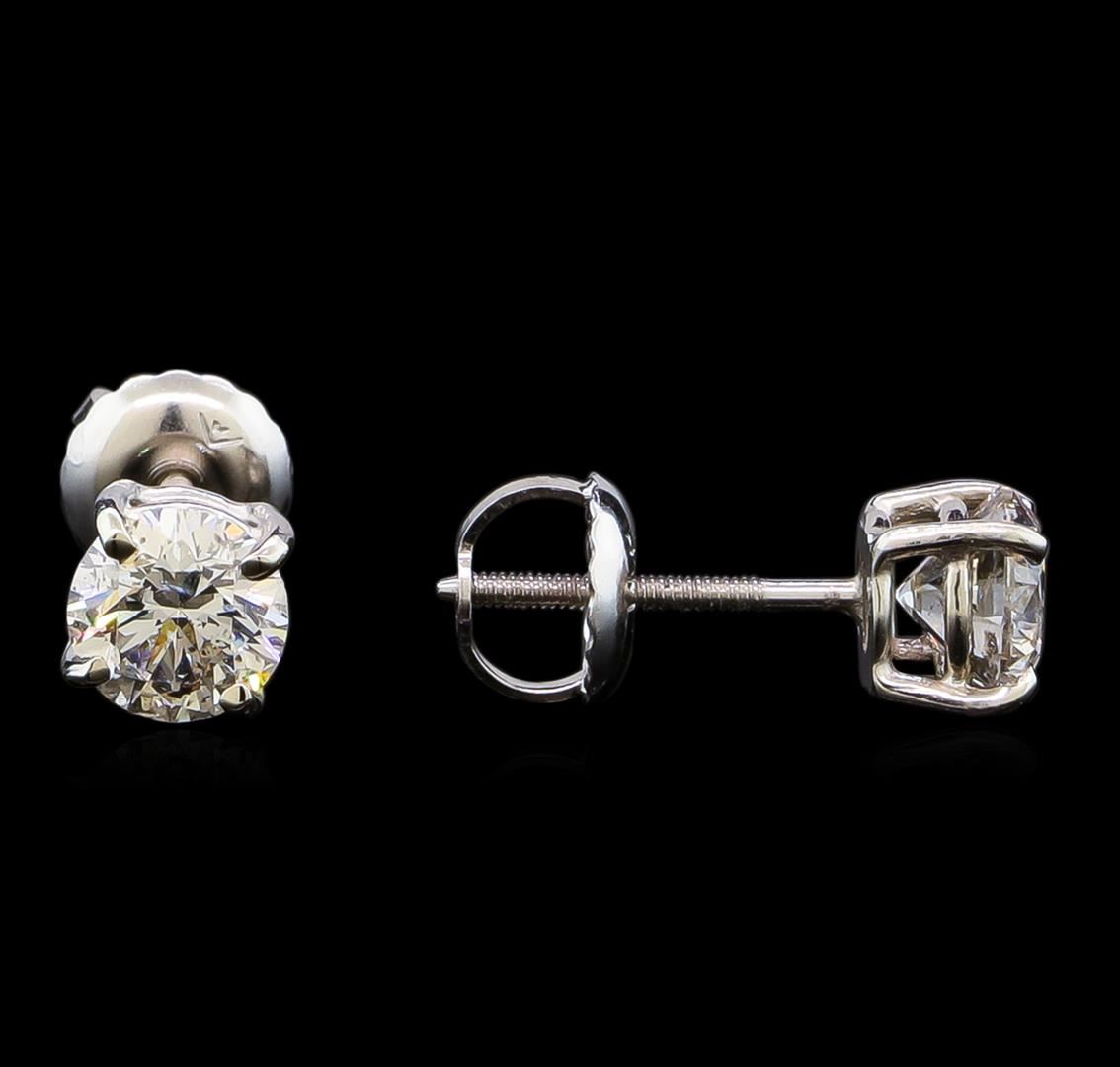 One pair electronically tested 14KT white gold lady's combination cast & assembled diamond stud earrings with threaded posts and screw-on/screw-off backs with a basket setting with a bright polish finish. Identified with markings of "14K". Condition is new, good workmanship. Containing: One prong set round brilliant cut diamond, measuring 5.04 - 4.98 x 3.46mm (depth est.) approximate weight of 0.53ct. Graded in the setting. Clarity: SI-2. Color: Good One prong set round brilliant cut diamond, measuring 5.00 - 4.96 x 3.24mm (depth est.) approximate weight of 0.50ct. Graded in the setting. Clarity: SI-2. Color: H - I. Cut Good. Total Weight of Diamonds 1.03ct. Total Weight of Stud Earrings 1.00gm. GAS Appraised at $6,395.00.