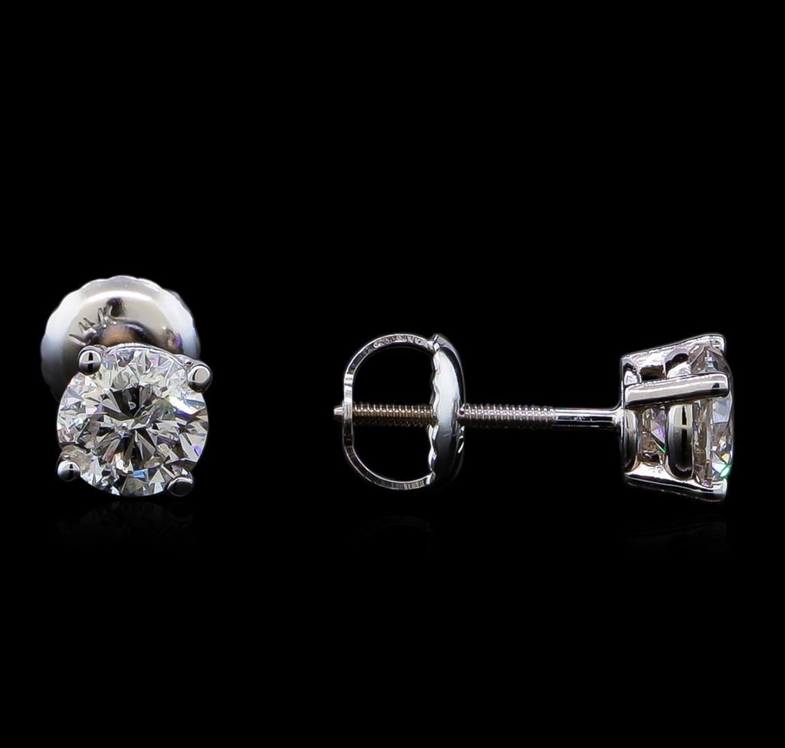 One pair electronically tested 14KT white gold lady's combination cast & assembled diamond stud earrings with threaded posts and screw-on/screw-off backs with a basket setting with a bright polish finish. Identified with markings of "14K". Condition is new, good workmanship. Containing: One prong set round brilliant cut diamond, measuring 5.07 - 5.04 x 3.50mm (depth est.) approximate weight of 0.53ct. Graded in the setting. Clarity: SI-2. Color: Good One prong set round brilliant cut diamond, measuring 5.01 - 5.00 x 3.26mm (depth est.) approximate weight of 0.50ct. Graded in the setting. Clarity: SI-3. Color: Good. Total Weight of Diamonds 1.03ct. Total Weight of Stud Earrings 1.00gm. GAS Appraised at $6,395.00.