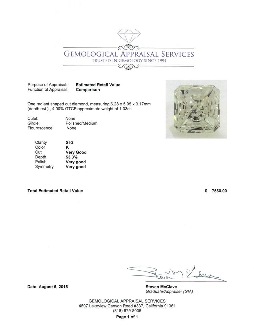 One radiant shaped cut diamond, measuring 6.28 x 5.95 x 3.17mm (depth est.), 4.00% GTCF approximate weight of 1.03ct. Culet: None. Girdle: Polished/Medium. Fluorescence: None. Clarity: SI-2. Color: K. Cut: Very Good. Depth: 53.3%. Polish: Very good. Symmetry: Very good. GAS Appraised at $7,560.00.