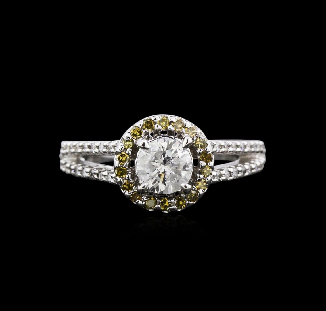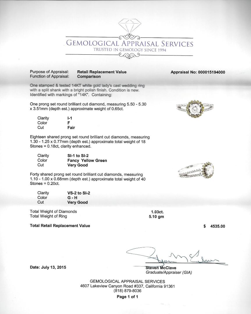 One stamped & tested 14KT white gold lady's cast wedding ring with a split shank with a bright polish finish. Condition is new. Identified with markings of "14K". Containing: One prong set round brilliant cut diamond, measuring 5.50 - 5.30 x 3.51mm (depth est.) approximate weight of 0.65ct. Clarity: I-1. Color: F. Cut: Fair. Eighteen shared prong set round brilliant cut diamonds, measuring 1.30 - 1.25 x 0.77mm (depth est.) approximate total weight of 18 Stones = 0.18ct, clarity enhanced. Clarity: SI-1 to SI-2. Color: Fancy Yellow Green. Cut: Very Good. Forty shared prong set round brilliant cut diamonds, measuring 1.10 - 1.00 x 0.68mm (depth est.) approximate total weight of 40 Stones = 0.20ct. Clarity: VS-2 to SI-2. Color: G - H. Cut: Very Good. Total Weight of Diamonds: 1.03ct. Total Weight of Ring: 5.10 gm. GAS Appraised at $4,535.00.