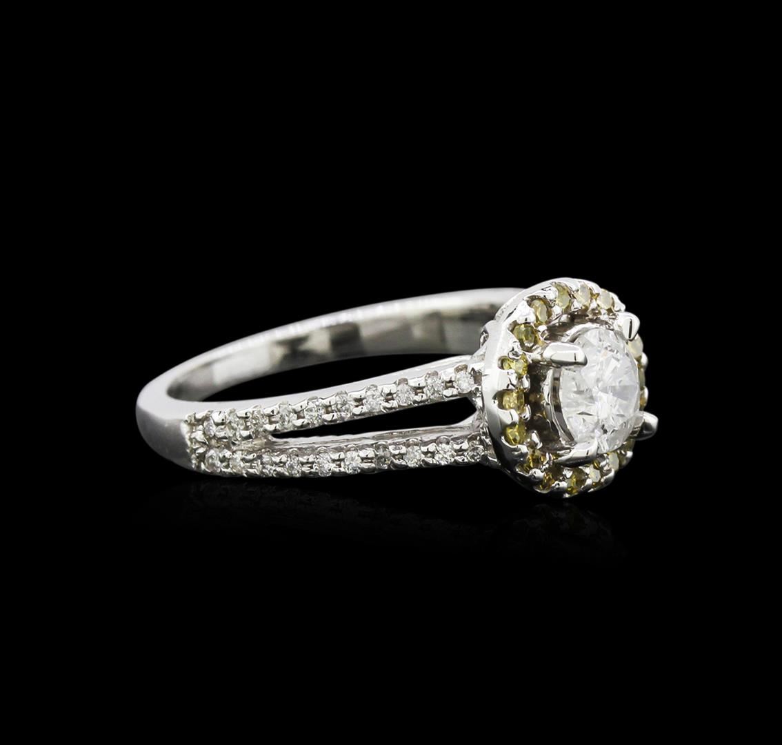 One stamped & tested 14KT white gold lady's cast wedding ring with a split shank with a bright polish finish. Condition is new. Identified with markings of "14K". Containing: One prong set round brilliant cut diamond, measuring 5.50 - 5.30 x 3.51mm (depth est.) approximate weight of 0.65ct. Clarity: I-1. Color: F. Cut: Fair. Eighteen shared prong set round brilliant cut diamonds, measuring 1.30 - 1.25 x 0.77mm (depth est.) approximate total weight of 18 Stones = 0.18ct, clarity enhanced. Clarity: SI-1 to SI-2. Color: Fancy Yellow Green. Cut: Very Good. Forty shared prong set round brilliant cut diamonds, measuring 1.10 - 1.00 x 0.68mm (depth est.) approximate total weight of 40 Stones = 0.20ct. Clarity: VS-2 to SI-2. Color: G - H. Cut: Very Good. Total Weight of Diamonds: 1.03ct. Total Weight of Ring: 5.10 gm. GAS Appraised at $4,535.00.