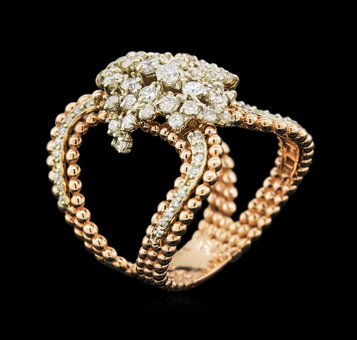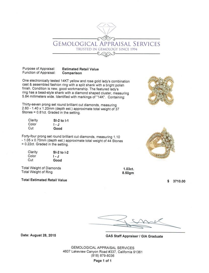 One electronically tested 14KT yellow and rose gold lady's combination cast & assembled fashion ring with a split shank with a bright polish finish. The featured lady's ring has a bead-style shank with a diamond shaped cluster, measuring 5.84 millimeters wide. Identified with markings of "14K". Condition is new, good workmanship. Containing: Thirty-Seven prong set round brilliant cut diamonds, measuring 2.60 - 1.40 x 1.20mm (depth est.) approximate total weight of 37 Stones = 0.81ct. Graded in the setting. Clarity: SI-2 to I-1. Color: I - Good Forty-Four prong set round brilliant cut diamonds, measuring 1.10 - 1.05 x 0.70mm (depth est.) approximate total weight of 44 Stones = 0.22ct. Graded in the setting. Clarity: SI-2 to I-2. Color: I - Good. Total Weight of Diamonds 1.03ct. Total Weight of Ring 8.50gm. GAS Appraised at $3,710.00.
