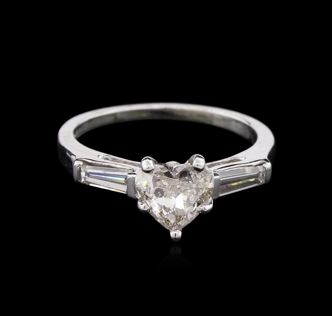 Platinum (PLAT) heart and marquise cut diamond ring. A heart shape diamond is prong mounted in the center of the ring. Two (2) baguette cut diamonds accent the ring on both sides of the center diamond. The ring is cast stamped "PLAT" and has a gross weight of 3.89 Grams. Diamond(s): (1) Diamond Setting. Shape: Baguette cut. Weight: 0.15 carat. Average Clarity: VS2. Average Color: I-J. Symmetry: Very Good. Polish: Very Good. (2)Diamond. Shape: Heart cut. Quantity: 1, Mounted. Weight: 0.88 carat. Dimensions: Length- 5.92 mm. ; Width- 6.62 mm. Girdle: Medium - Slightly Thick, Faceted. Culet: None. Clarity: SI1-SI2. Color: I-J. Symmetry: Very Good. Polish: Very Good. Fluorescence: None. Internal Inclusions: (1) feather, (2) Crystal. Metal(s): Metal: Platinum, Stamped. Purity: 950. Color: White. Condition: Excellent. Finish: High polish. GGA Appraised at $7,966.00.