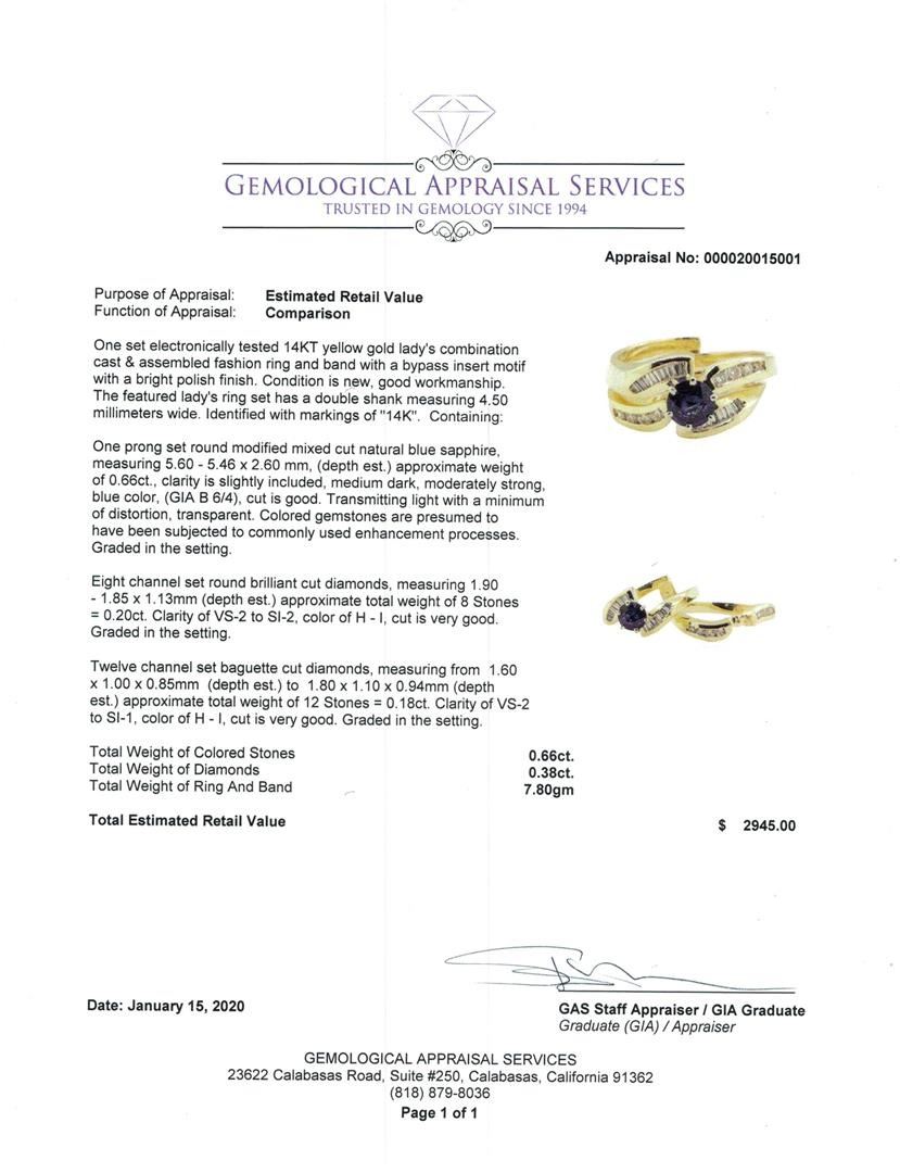 One set electronically tested 14KT yellow gold lady's combination cast & assembled fashion ring and band with a bypass insert motif with a bright polish finish. The featured lady's ring set has a double shank measuring 4.50 millimeters wide. Identified wi