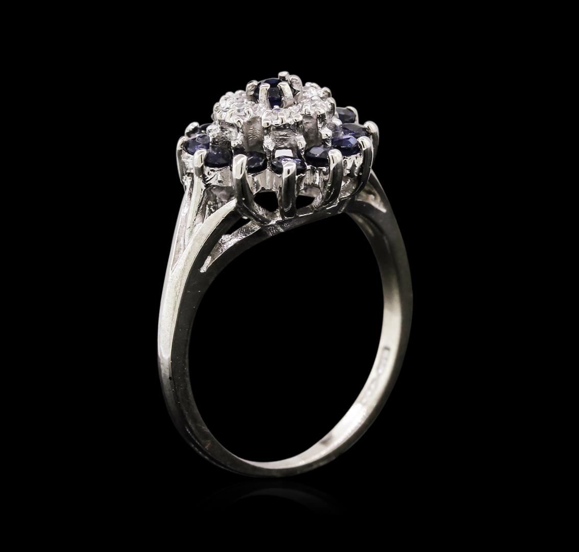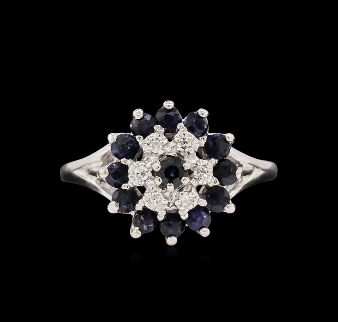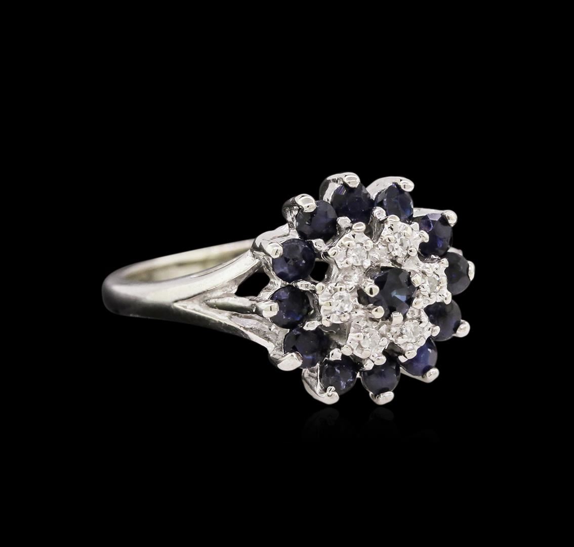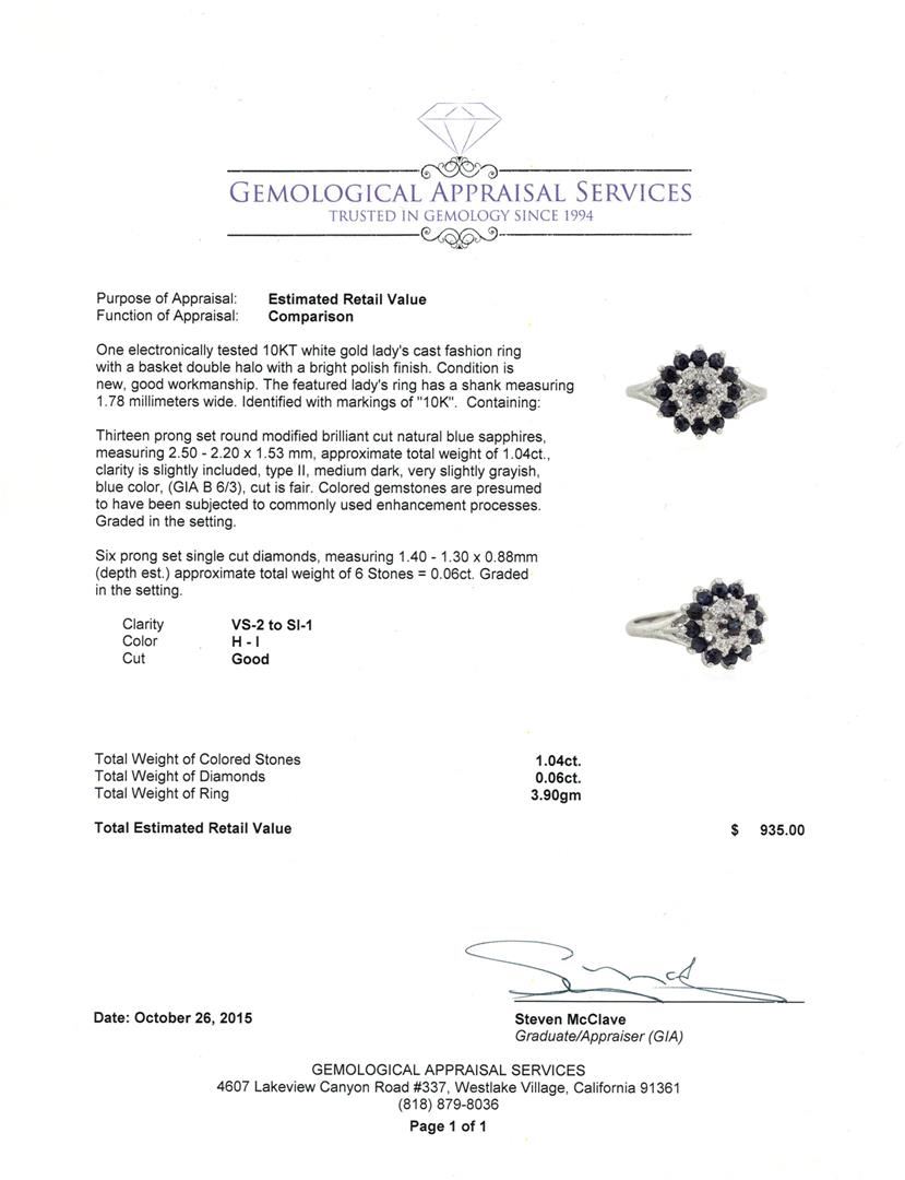 One electronically tested 10KT white gold lady's cast fashion ring with a basket double halo with a bright polish finish. The featured lady's ring has a shank measuring 1.78 millimeters wide. Identified with markings of "10K". Condition is new, good workmanship. Containing: Thirteen prong set round modified brilliant cut natural blue sapphires, measuring 2.50 - 2.20 x 1.53 mm, approximate total weight of 1.04ct., clarity is slightly included, type II, medium dark, very slightly grayish, blue color, (GIA B 6/3), cut is fair. Colored gemstones are presumed to have been subjected to commonly used enhancement processes. Graded in the setting. Six prong set single cut diamonds, measuring 1.40 - 1.30 x 0.88mm (depth est.) approximate total weight of 6 Stones = 0.06ct. Graded in the setting. Clarity: VS-2 to SI-1. Color: H - I. Cut Good. Total Weight of Colored Stones 1.04ct. Total Weight of Diamonds 0.06ct. Total Weight of Ring 3.90gm. GAS Appraised at $935.00.