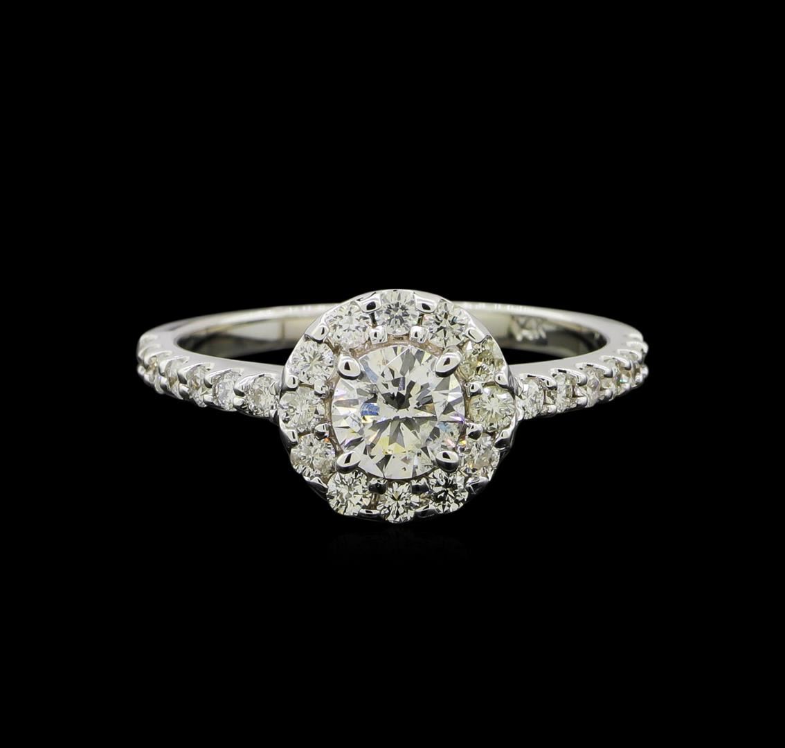 One electronically tested 14KT white gold lady's cast wedding ring with a halo with a bright polish finish. The featured lady's ring has a shank measuring 1.81 millimeters wide. Identified with markings of '14K'. Condition is new, good workmanship. Containing: One prong set round brilliant cut diamond, measuring 5.14 - 5.10 x 3.35mm (depth est.) approximate weight of 0.55ct. Graded in the setting. Clarity SI-1. Color: I Cut Good Twelve prong set round brilliant cut diamonds, measuring 1.85 - 1.75 x 1.12mm (depth est.) approximate total weight of 12 Stones = 0.27ct. Graded in the setting. Clarity SI-1 to I-1. Color: H - I Cut Good Fourteen prong set round brilliant cut diamonds, measuring 1.65 - 1.55 x 0.99mm (depth est.) approximate total weight of 14 Stones = 0.22ct. Graded in the setting. Clarity SI-1 to I-1. Color: H - I Cut Good. Total Weight of Diamonds 1.04ct.. Total Weight of Ring 2.60gm. GAS Appraised at $4,865.00.