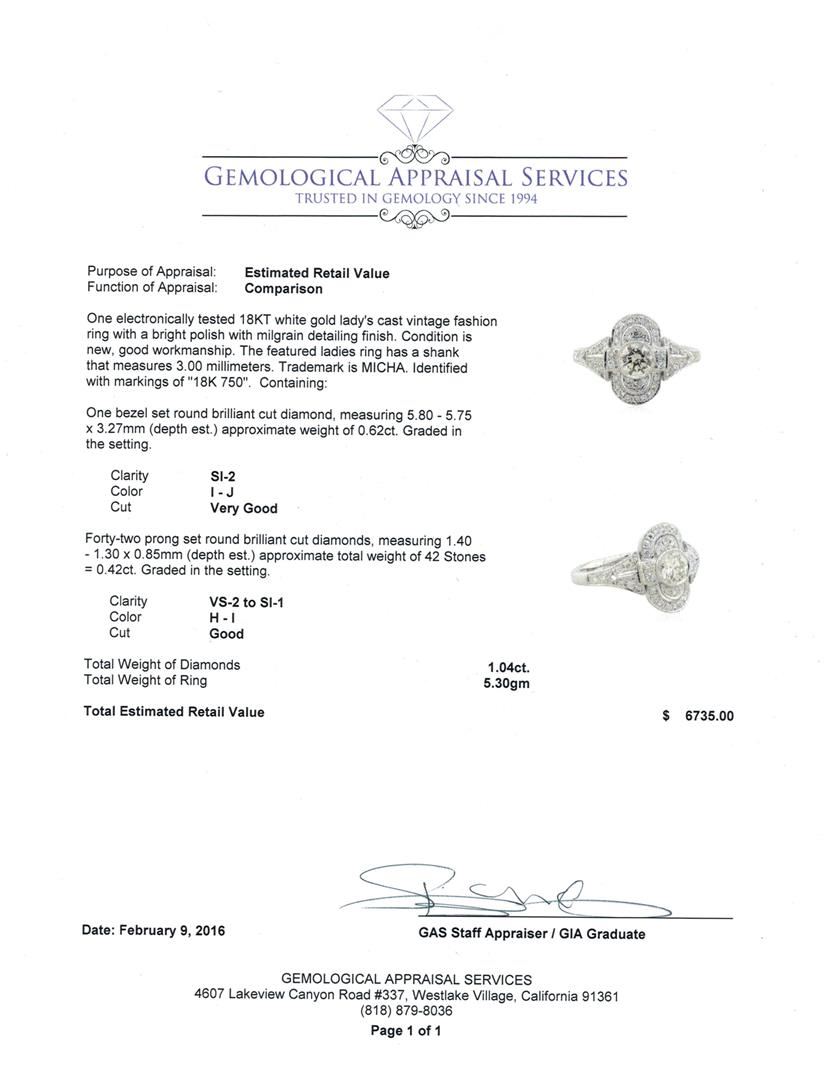 One electronically tested 18KT white gold lady's cast vintage fashion ring with a bright polish with milgrain detailing finish. The featured ladies ring has a shank that measures 3.00 millimeters. Trademark is MICHA. Identified with markings of "18K 750". Condition is new, good workmanship. Containing: One bezel set round brilliant cut diamond, measuring 5.80 - 5.75 x 3.27mm (depth est.) approximate weight of 0.62ct. Graded in the setting. Clarity: SI-2. Color: I - Very Good Forty-Two prong set round brilliant cut diamonds, measuring 1.40 - 1.30 x 0.85mm (depth est.) approximate total weight of 42 Stones = 0.42ct. Graded in the setting. Clarity: VS-2 to SI-1. Color: H - I. Cut Good. Total Weight of Diamonds 1.04ct. Total Weight of Ring 5.30gm. GAS Appraised at $6,735.00.