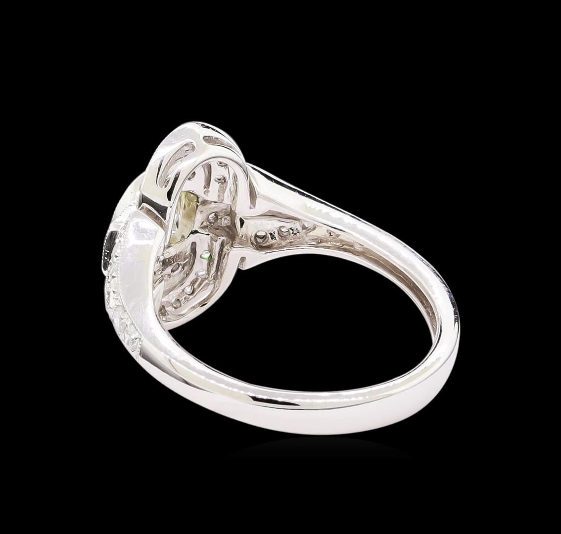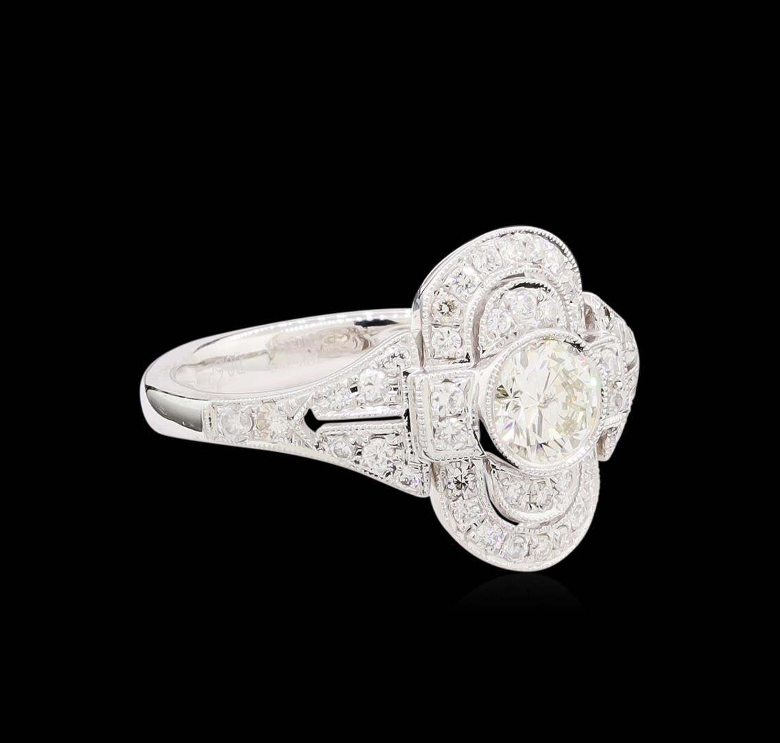 One electronically tested 18KT white gold lady's cast vintage fashion ring with a bright polish with milgrain detailing finish. The featured ladies ring has a shank that measures 3.00 millimeters. Trademark is MICHA. Identified with markings of "18K 750". Condition is new, good workmanship. Containing: One bezel set round brilliant cut diamond, measuring 5.80 - 5.75 x 3.27mm (depth est.) approximate weight of 0.62ct. Graded in the setting. Clarity: SI-2. Color: I - Very Good Forty-Two prong set round brilliant cut diamonds, measuring 1.40 - 1.30 x 0.85mm (depth est.) approximate total weight of 42 Stones = 0.42ct. Graded in the setting. Clarity: VS-2 to SI-1. Color: H - I. Cut Good. Total Weight of Diamonds 1.04ct. Total Weight of Ring 5.30gm. GAS Appraised at $6,735.00.