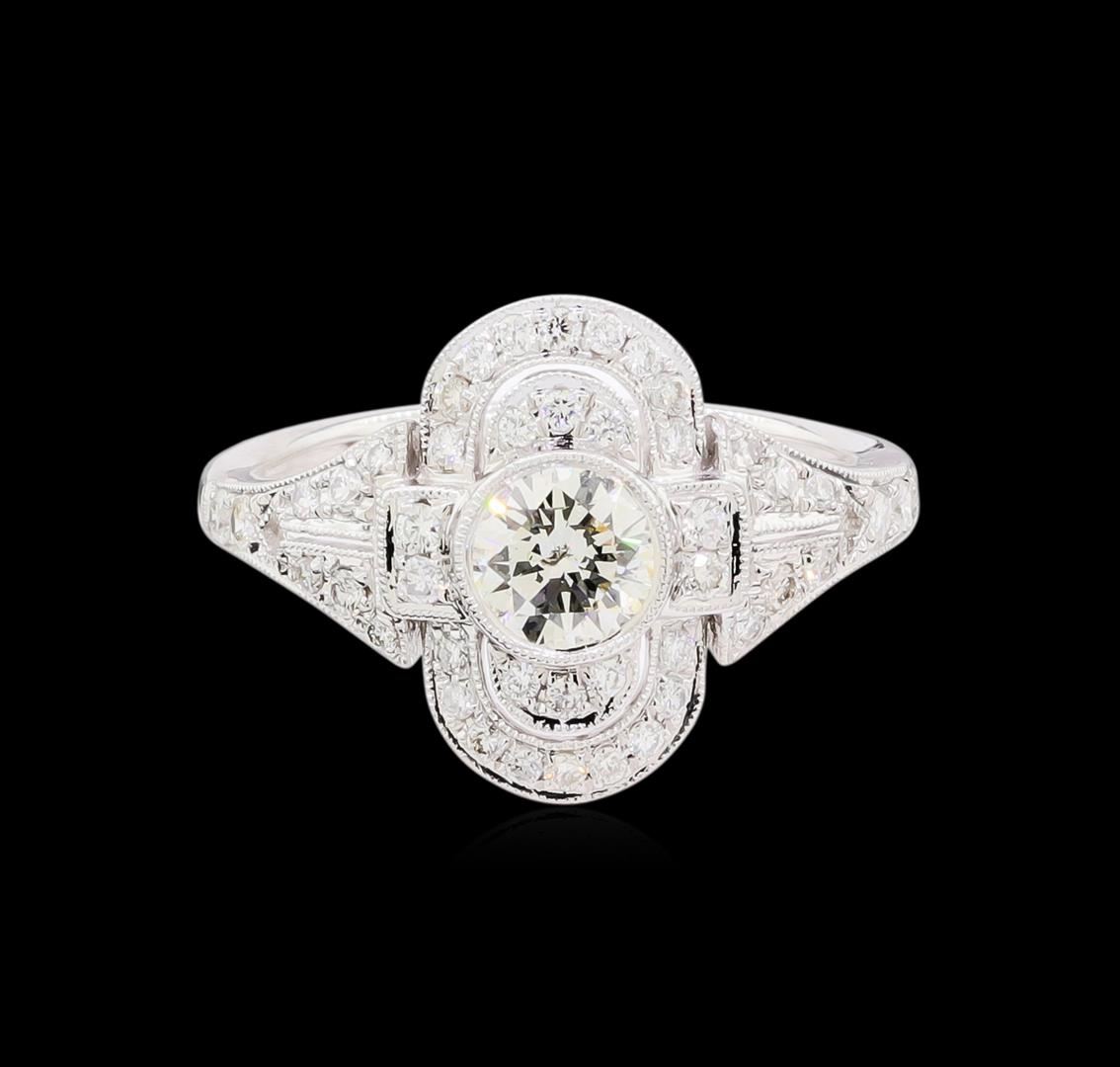 One electronically tested 18KT white gold lady's cast vintage fashion ring with a bright polish with milgrain detailing finish. The featured ladies ring has a shank that measures 3.00 millimeters. Trademark is MICHA. Identified with markings of "18K 750". Condition is new, good workmanship. Containing: One bezel set round brilliant cut diamond, measuring 5.80 - 5.75 x 3.27mm (depth est.) approximate weight of 0.62ct. Graded in the setting. Clarity: SI-2. Color: I - Very Good Forty-Two prong set round brilliant cut diamonds, measuring 1.40 - 1.30 x 0.85mm (depth est.) approximate total weight of 42 Stones = 0.42ct. Graded in the setting. Clarity: VS-2 to SI-1. Color: H - I. Cut Good. Total Weight of Diamonds 1.04ct. Total Weight of Ring 5.30gm. GAS Appraised at $6,735.00.