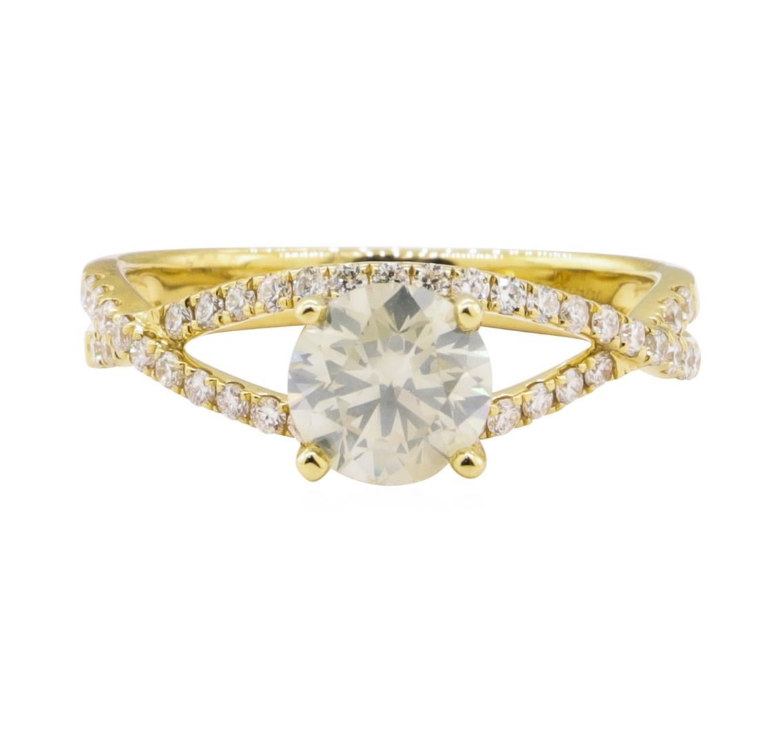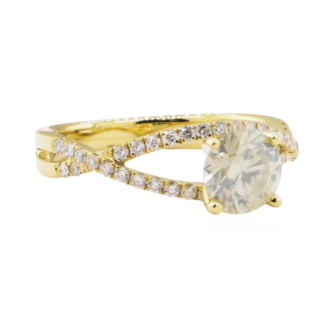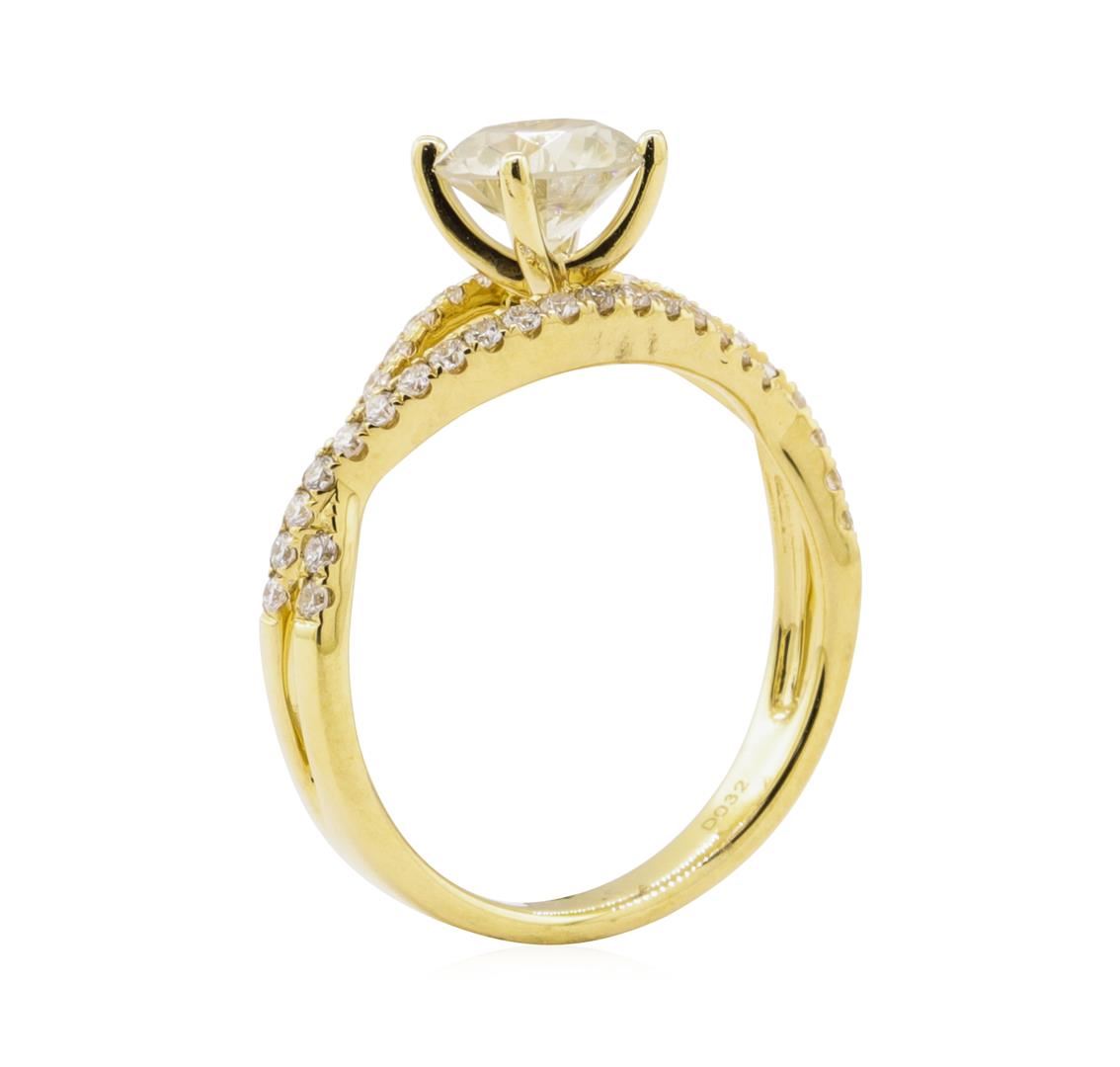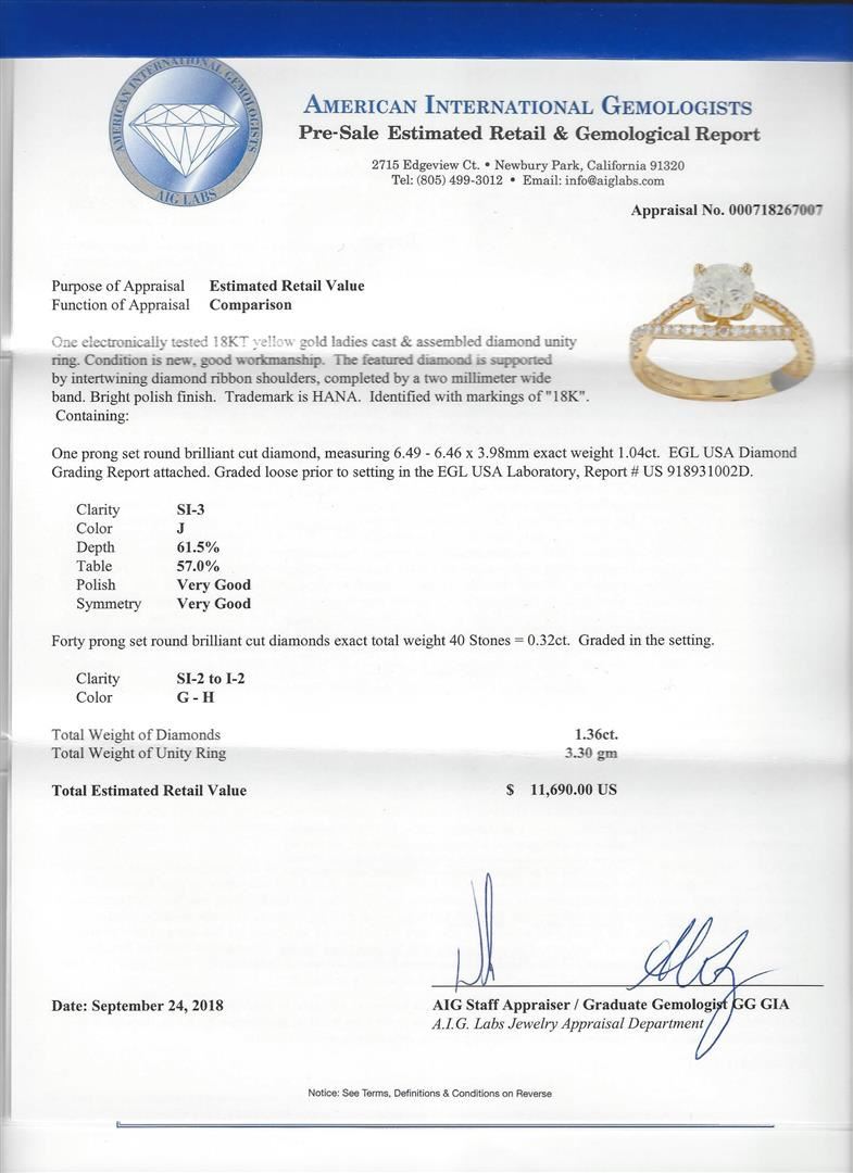 One electronically tested 18KT yellow gold ladies cast & assembled diamond unity ring. Condition is new, good workmanship. The featured diamond is supported by intertwining diamond ribbon shoulders, completed by a two millimeter wide band. Bright polish ?nish. Trademark is HANA. Identi?ed with mark mgs of "18K Containing: One prong set round brilliant cut diamond, measuring 6.49 - 6.46 x 3.98mm exact Weight l.O4ct. EGL USA Diamond Grading Repon attached. Graded loose prior to setting in the EGL USA Laboratory, Report # US 918931002D. Clarity SI-3 Color J Depth 61.5% Table 57.0% Posh Very Good Symmetry Very Good Forty prong set round brilliant cut diamonds exact total weight 40 Stones = 0.32ct. Graded in the setting Clarity S1-2 to I-2 Color G - H Total Weight of Diamonds 1.36ct. Total Weight of Unity Ring 3.30 gm Total Estimated Retail Value S 11,690.00 US