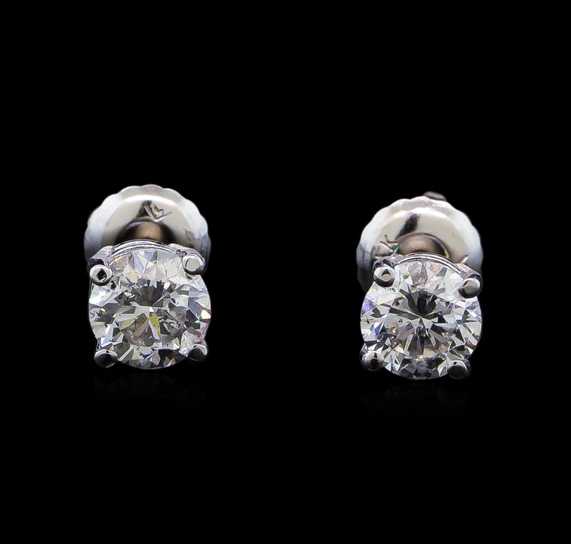 One pair electronically tested 14KT white gold lady's combination cast & assembled diamond stud earrings with threaded posts and screw-on/screw-off backs with a basket setting with a bright polish finish. Identified with markings of "14K". Condition is new, good workmanship. Containing: One prong set round brilliant cut diamond, measuring 5.08 - 5.05 x 3.40mm (depth est.) approximate weight of 0.53ct. Graded in the setting. Clarity: SI-2. Color: Good One prong set round brilliant cut diamond, measuring 5.01 - 5.00 x 3.36mm (depth est.) approximate weight of 0.51ct. Graded in the setting. Clarity: SI-3. Color: Good. Total Weight of Diamonds 1.04ct. Total Weight of Stud Earrings 1.00gm. GAS Appraised at $6,300.00.