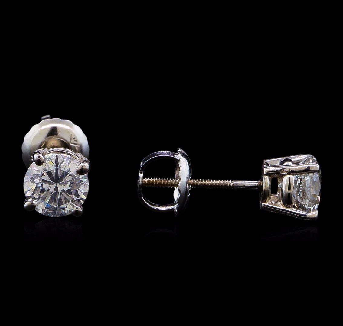 One pair electronically tested 14KT white gold lady's combination cast & assembled diamond stud earrings with threaded posts and screw-on/screw-off backs with a basket setting with a bright polish finish. Identified with markings of "14K". Condition is new, good workmanship. Containing: One prong set round brilliant cut diamond, measuring 5.06 - 5.04 x 3.23mm (depth est.) , 3.00.%. GTCF approximate weight of 0.53ct. Graded in the setting. Clarity: SI-2. Color: Good One prong set round brilliant cut diamond, measuring 5.01 - 5.00 x 3.36mm (depth est.) approximate weight of 0.51ct. Graded in the setting. Clarity: SI-2. Color: Good. Total Weight of Diamonds 1.04ct. Total Weight of Stud Earrings 1.00gm. GAS Appraised at $6,755.00.