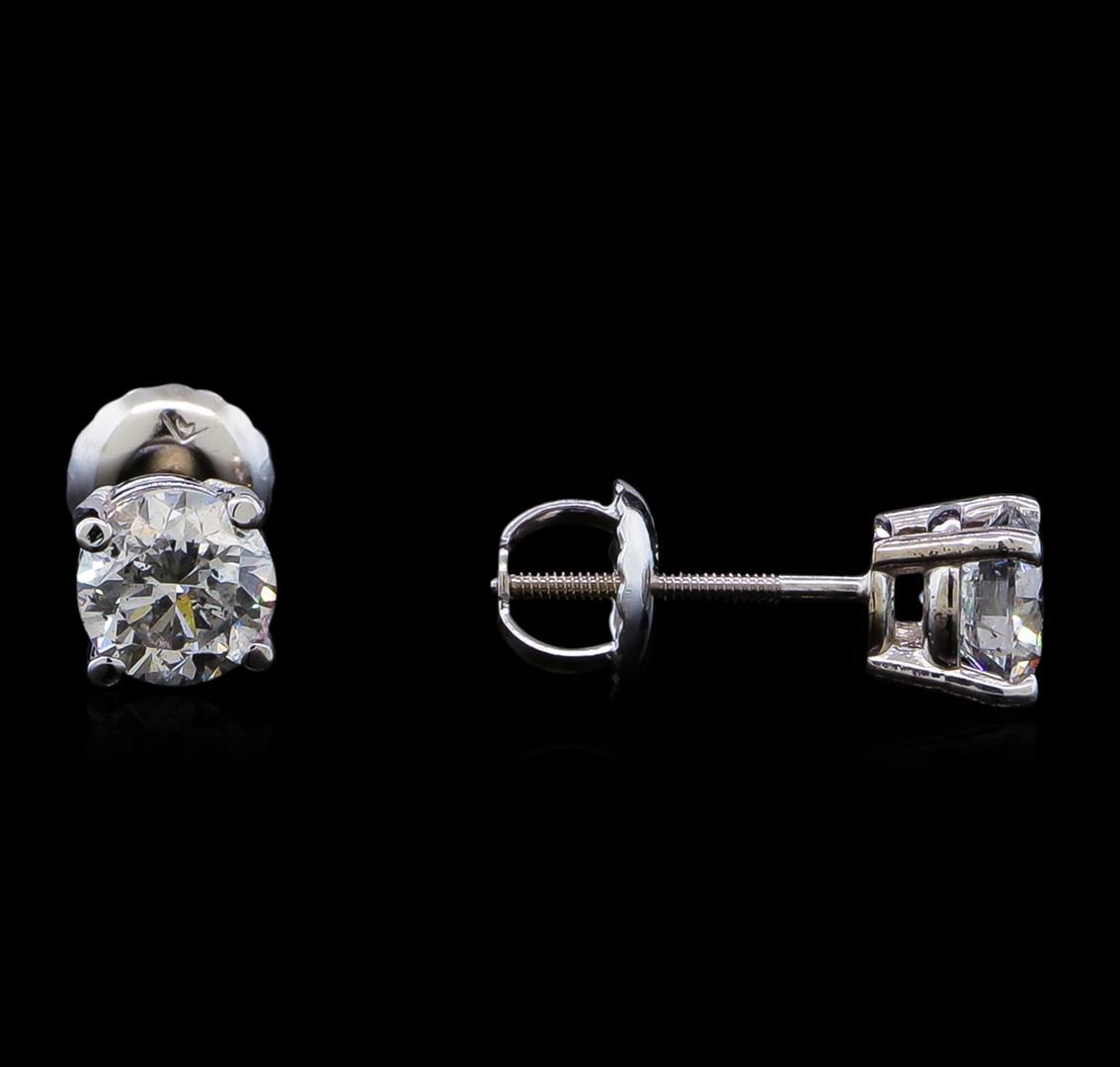 One pair electronically tested 14KT white gold lady's combination cast & assembled diamond stud earrings with threaded posts and screw-on/screw-off backs with a basket setting with a bright polish finish. Identified with markings of "14K". Condition is new, good workmanship. Containing: One prong set round brilliant cut diamond, measuring 5.08 - 5.05 x 3.40mm (depth est.) approximate weight of 0.53ct. Graded in the setting. Clarity: SI-2. Color: Good One prong set round brilliant cut diamond, measuring 5.01 - 5.00 x 3.36mm (depth est.) approximate weight of 0.51ct. Graded in the setting. Clarity: SI-3. Color: Good. Total Weight of Diamonds 1.04ct. Total Weight of Stud Earrings 1.00gm. GAS Appraised at $6,300.00.