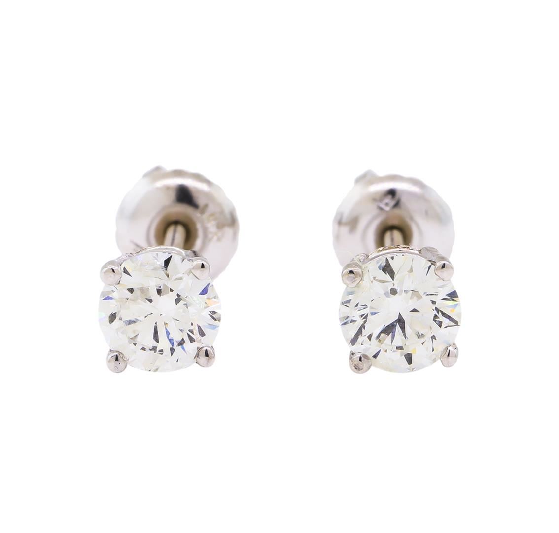 One pair electronically tested 14KT white gold lady's combination cast & assembled stud earrings with threaded posts and screw-on/screw-off backs with a bright polish finish. Identified with markings of "14K". Condition is new, good workmanship. Containing: Two prong set round brilliant cut diamonds, measuring 5.03 - 4.87 x 3.17mm (depth est.) approximate total weight of 2 Stones = 1.04ct. Graded in the setting. Clarity: SI-1 to I-1. Color: F - G. Cut Very Good. Total Weight of Diamonds 1.04ct. Total Weight of Earrings 1.00gm. GAS Appraised at $7,050.00.