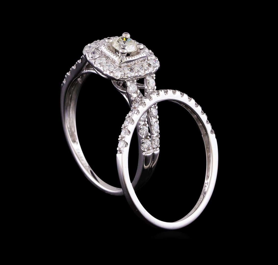 One set electronically tested 14KT white gold lady's cast wedding ring & wedding band with a split shank cathedral halo with a bright polish finish. The featured lady's ring set has a double shank measuring 2.56 millimeters in width. Identified with markings of '14K'. Condition is new, good workmanship. Containing: One prong set round brilliant cut diamond, measuring 3.70 - 3.68 x 2.40mm (depth est.) approximate weight of 0.20ct. Graded in the setting. Clarity SI-1. Color: H Cut Very Good Fifty-One prong set round brilliant cut diamonds, measuring 1.70 - 1.60 x 0.99mm (depth est.) approximate total weight of 51 Stones = 0.84ct. Graded in the setting. Clarity SI-1 to SI-2. Color: G - H Cut Good. Total Weight of Diamonds 1.04ct.. Total Weight of Ring & Wedding Band 3.80gm. GAS Appraised at $3,830.00.