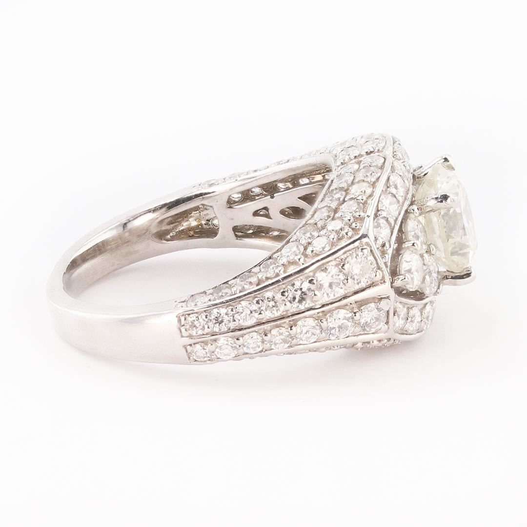 One electronically tested platinum ladies cast diamond unity ring with a bright polish finish. Condition is new, good workmanship. The featured diamond is accented by a diamond trio on either side supported by mirroring diamond ribbons, completed by a two millimeter wide band. Trademark is Orianne. Identified with markings of "PT950". Containing: One prong set round brilliant cut diamond, measuring 6.30 - 6.16 x 4.12mm exact weight 1.04ct with a faint blue fluorescence. Graded loose prior to setting. Clarity: SI-1 Color: H Depth: 66.1% Table: 61.0% Pavil. Depth%: 46.0% One hundred fourteen prong set round brilliant cut diamonds approximate total weight of 114 Stones = 1.46ct. Graded in the setting. Clarity: SI-1 to SI-2 Color: F-H Total Weight of Diamonds: 2.50ct. Total Weight of Ring: 7.77 gm Size: 4 1/2