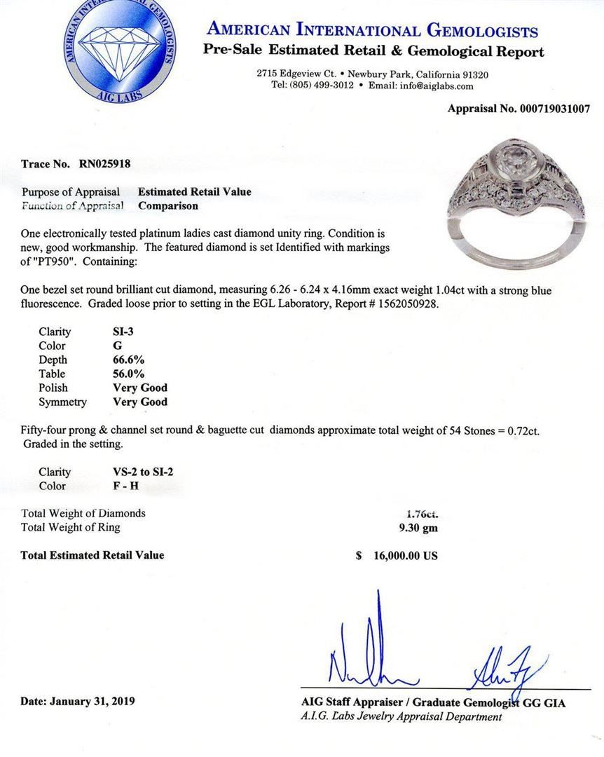 1.04ct SI3 CLARITY CENTER Diamond Platinum Ring (1.76ctw Diamonds) EGL CERTIFIED. One electronically tested platinum ladies cast diamond unity ring. Condition is new, good workmanship. The featured diamond is set Identified with markings of "PT950". Containing: One bezel set round brilliant cut diamond, measuring 6.26 - 6.24 x 4.16mm exact weight 1.04ct with a strong blue fluorescence. Graded loose prior to setting in the EGL Laboratory, Report 1562050928. Clarity SI3 Color G Depth 66.6% Table 56.0% Polish Very Good Symmetry Very Good Fifty-four prong & channel set round & baguette cut diamonds approximate total weight of 54 Stones = 0.72ctw. Graded in the setting. Clarity VS2 to SI2 Color F - H Total Weight of Diamonds 1.76ctw. Total Weight of Ring 9.30 gm
