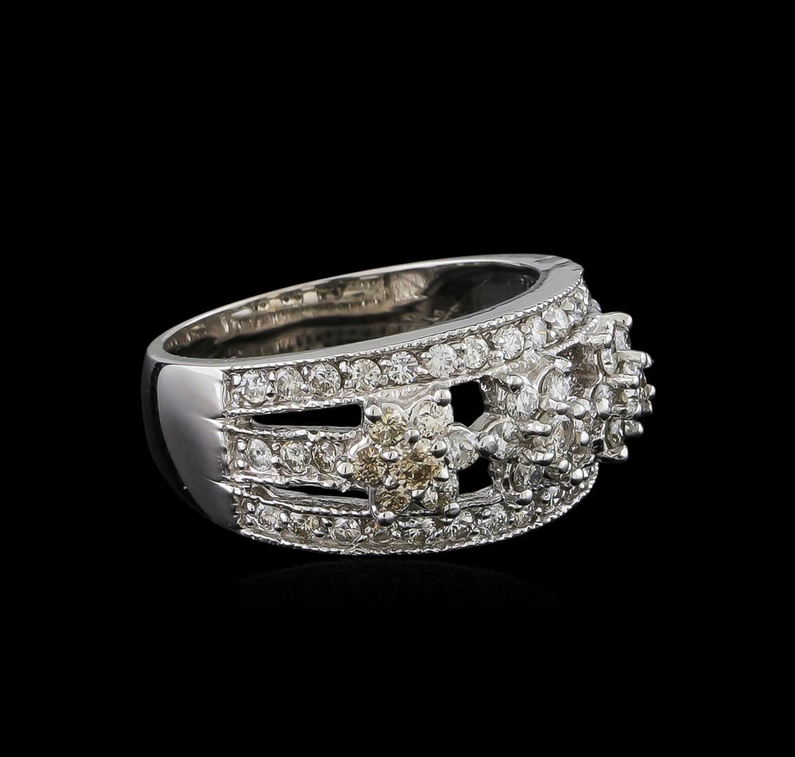 One electronically tested 14KT white gold lady's cast fashion ring with a tapered shank with a bright polish with milgrain detailing finish. The featured lady's ring has a shank measuring 4.49 millimeters wide. Identified with markings of "14K". Condition is new, good workmanship. Containing: Three prong set round brilliant cut diamonds, measuring 2.60 - 2.50 x 1.58mm (depth est.) approximate total weight of 3 Stones = 0.19ct. Graded in the setting. Clarity: SI-1 to I-1. Color: H - L. Cut Good Eighteen prong set round brilliant cut diamonds, measuring 1.80 - 1.70 x 1.05mm (depth est.) approximate total weight of 18 Stones = 0.35ct. Graded in the setting. Clarity: SI-1 to SI-2. Color: H - K. Cut Good Thirty-Six prong set round brilliant cut diamonds, measuring 1.60 - 1.50 x 0.96mm (depth est.) approximate total weight of 36 Stones = 0.50ct. Graded in the setting. Clarity: SI-1 to I-1. Color: H - I. Cut Good. Total Weight of Diamonds 1.04ct. Total Weight of Ring 6.40gm. GAS Appraised at $3,415.00.