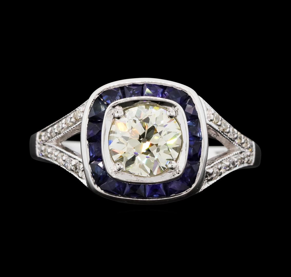 One electronically tested 18KT white gold lady's cast vintage style fashion ring with a split cathedral shank with a halo with a bright polish with milgrain detailing finish. The featured lady's ring has a shank measuring 2.11 millimeters wide. Identified GAS Appraised at $10,860.00.
