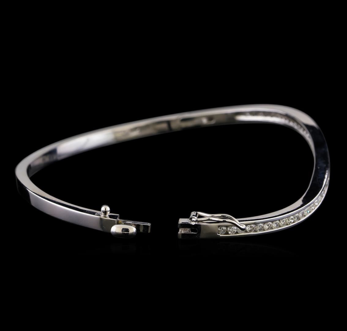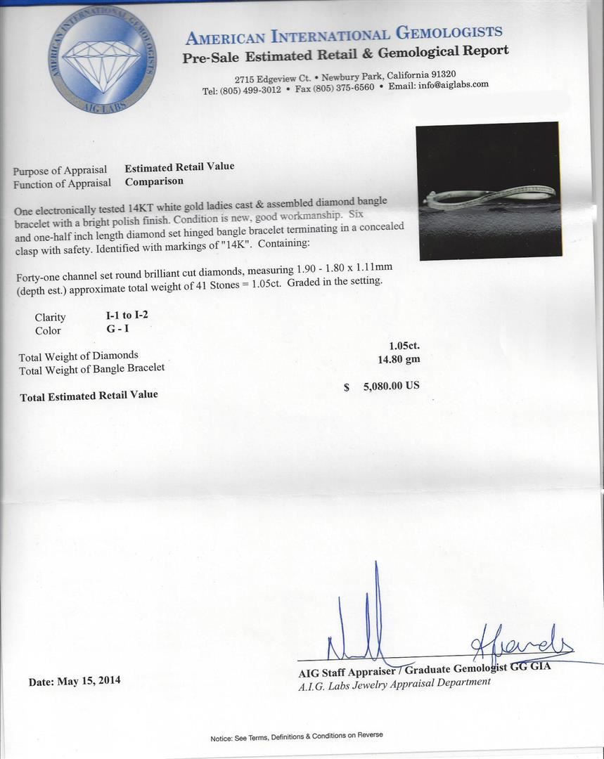 One electronically tested 14KT white gold ladies cast and assembled diamond bangle bracelet with a bright polish finish. Condition is new, good workmanship. Six and one-half inch length diamond set hinged bangle bracelet terminating in a concealed clasp with safety. Identified with markings of "14K". Containing: Forty-one channel set round brilliant cut diamonds, measuring 1.90 - 1.80 x 1.11mm (depth est.) approximate total weight of 41 Stones = 1.05ct. Graded in the setting. Clarity of I-1 to I-2, color of G-I. Total Weight of Diamonds: 1.05ct, Total Weight of Bangle Bracelet: 14.80 grams. AIG Appraised at $5,080.00.
